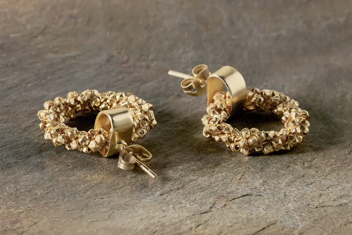 Striking yet unfussy, these warm gold plated Mula earrings are made from strings of intricately hand cut brass beads and finished with a smooth, simple clasp. Ideal for eveningwear or dressing up a daytime look with a little sparkle. Hypoallergenic and nickel free.