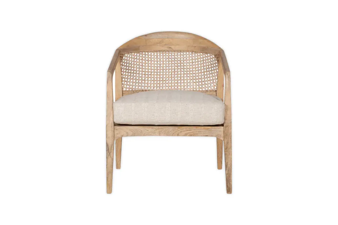 Our Nabhi chair is a perfect example of timeless design that marries time-honoured craftsmanship with natural materials. This beautifully proportioned piece is handcrafted from solid mango wood with a simple organic silhouette that follows a natural curve, creating an elegantly tactile frame that is as supportive as it looks inviting. A handwoven cane panel adorns the back, creating a comfortable support, while the generously upholstered slubby cotton cushion is supremely soft and lends an overall understated look to this skilfully crafted piece. An heirloom piece that will look striking in any living space, from reading nook to bedroom or garden room.