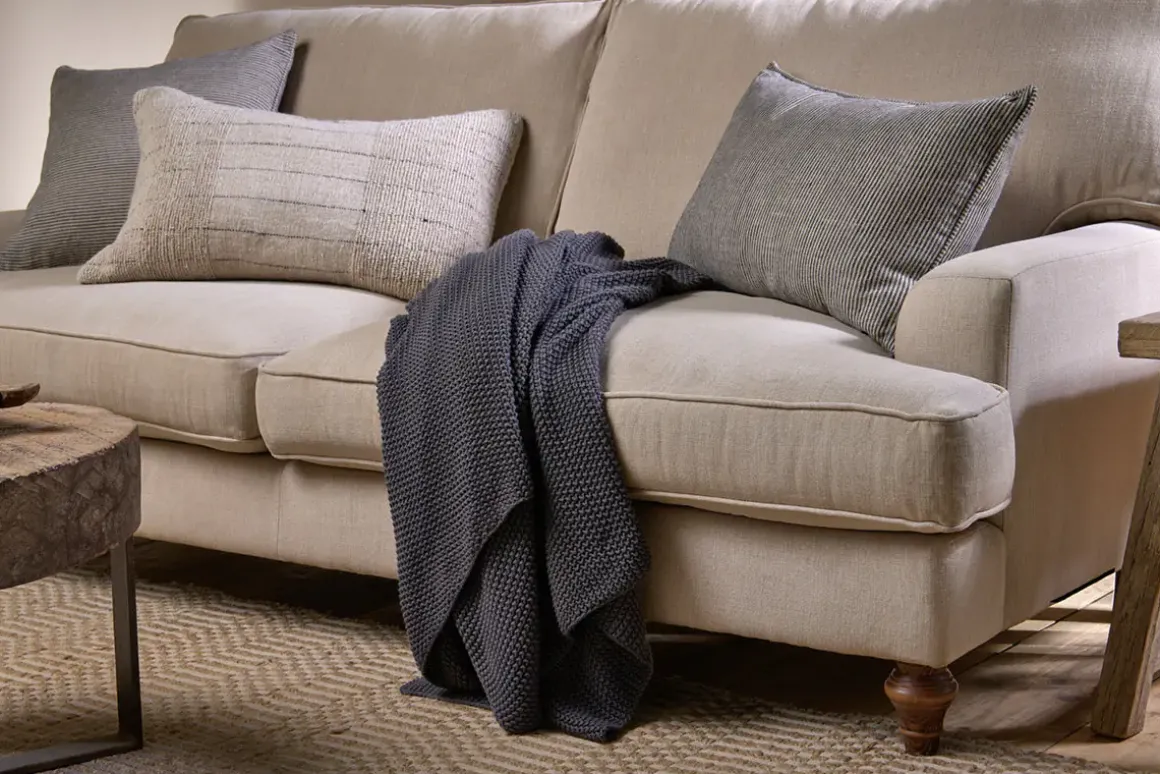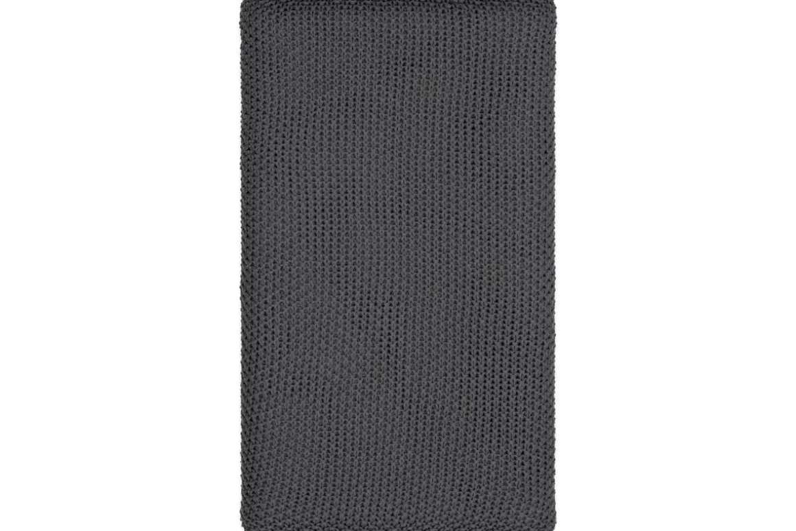 This tactile knitted throw is made from natural yarn-dyed cotton using a loose stitch known as a ‘moss stitch’.Soft, thick and cosy, it’s perfect for snuggling up. The classic charcoal colour is elegantly neutral, subtly adding texture and comfort to any interior when layered over a favourite armchair, sofa or bed. Available in four colours.