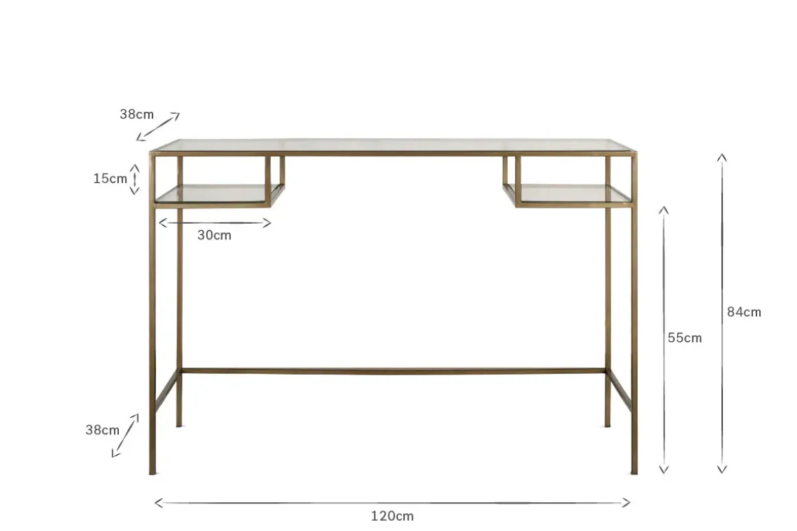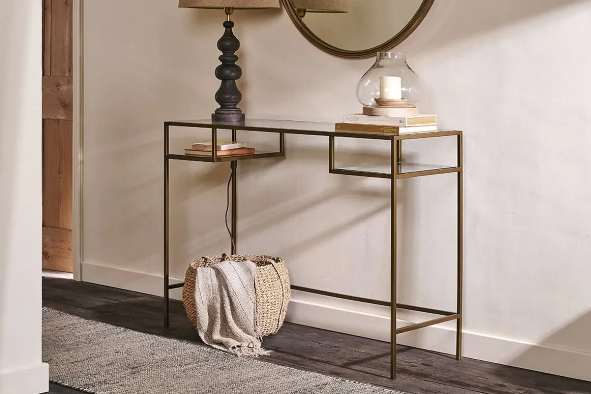 With its warm brass framework and generous glass panels, our well designed Nakuru console table has an elegant, contemporary feel. Two practical compartments make it easy to store your belongings while keeping the top of the table clear for decorative items. Its size and shape mean it’s ideal for positioning in a hallway but its pared back aesthetic makes it a versatile and sophisticated addition for almost any interior. Style with other pieces in the Nakuru collection for a striking and harmonious arrangement.