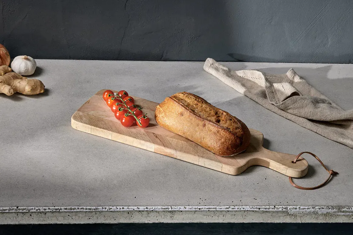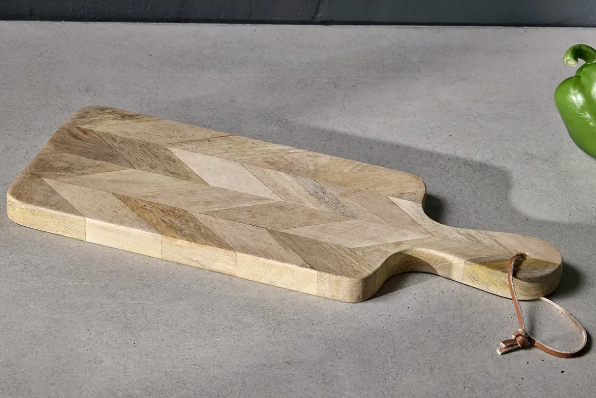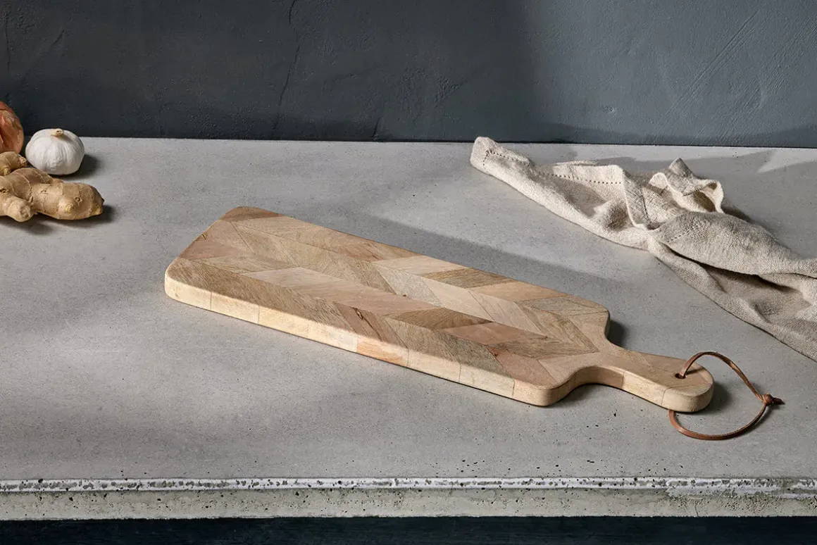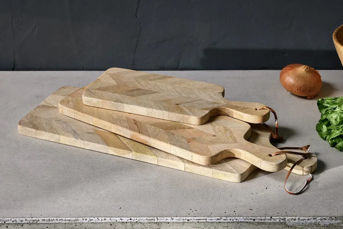These long, rectangular, Nalbari Chopping Boards are striking and practical. Skilfully pieced together from segments of sustainable mango wood, the natural colour variations create an interesting and texture rich patchwork. Use them as a chopping board or sharing platter for informal delights from antipasti to artisan breads.