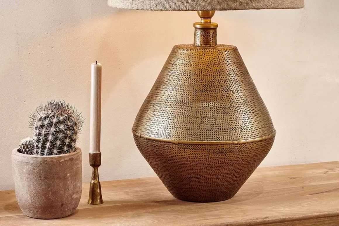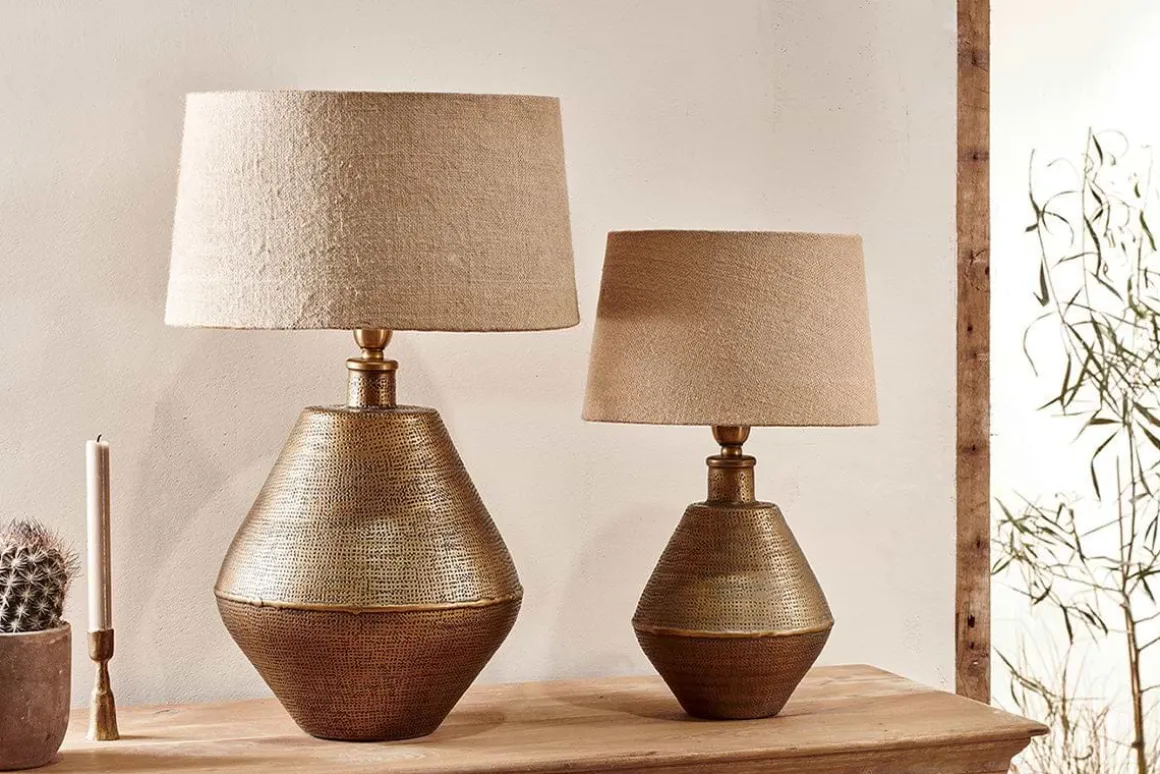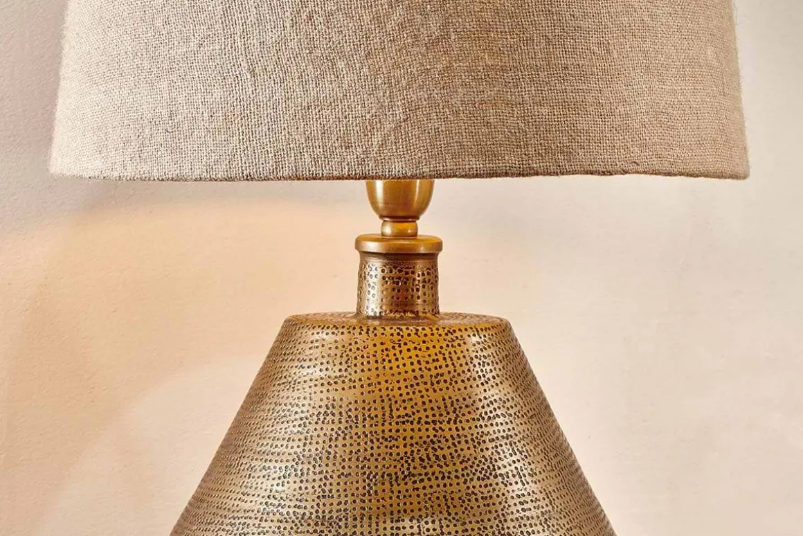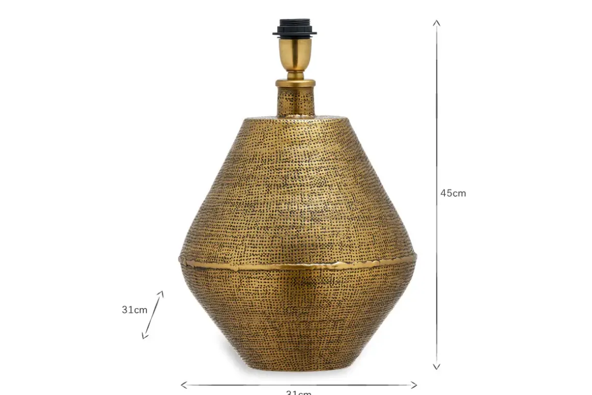 The unique shape and rich antique brass of our handcrafted Nalgonda table lamp makes it a striking addition to any room. The decorative pattern has been carefully applied using traditional tools. The lamp showcases the handmade process with an exposed soldered join. These artisan touches and irregularities add an individual charm to each lamp.