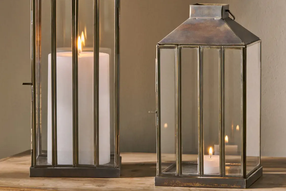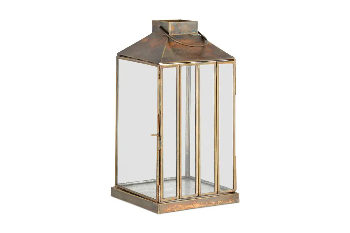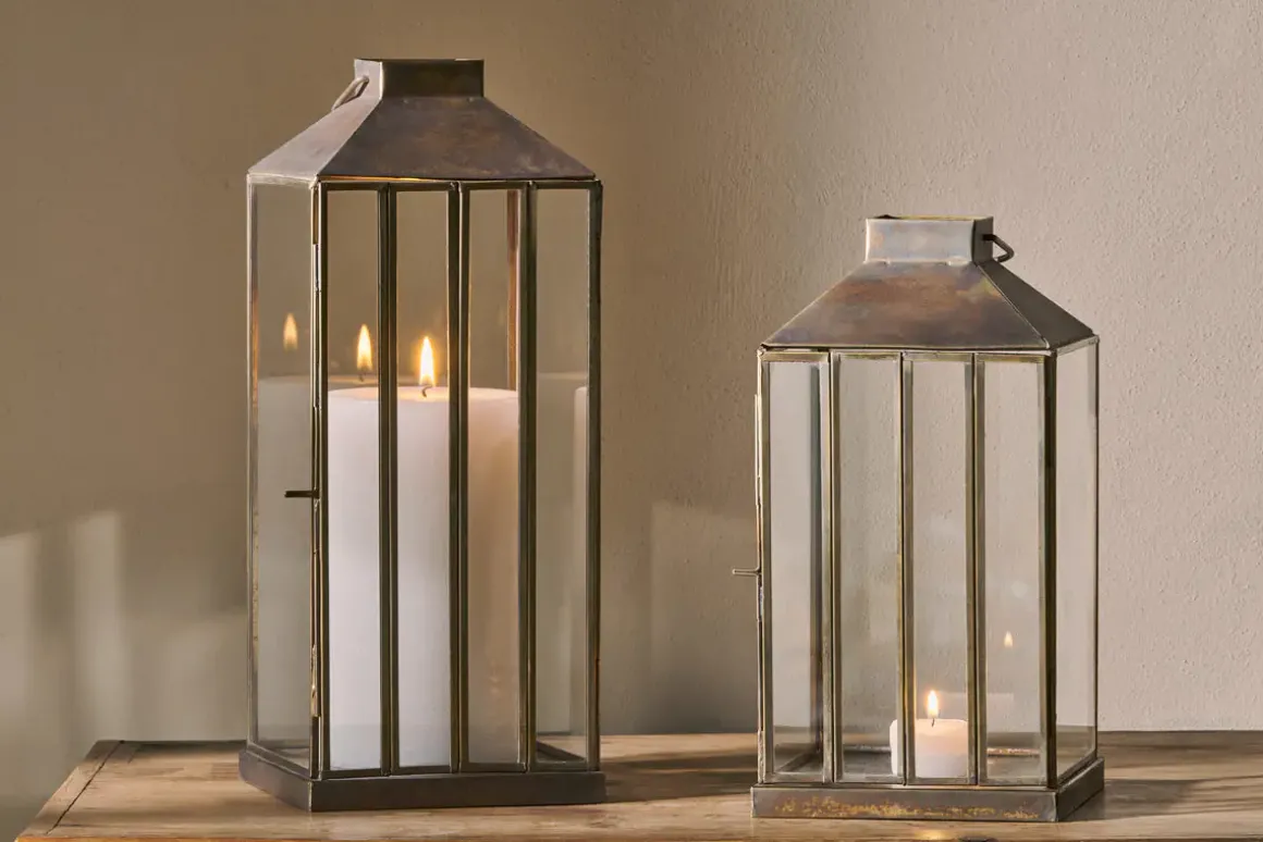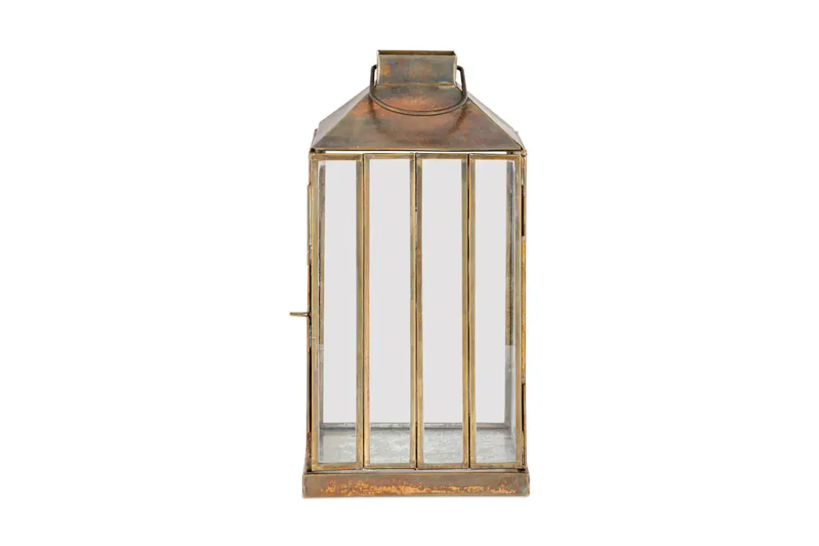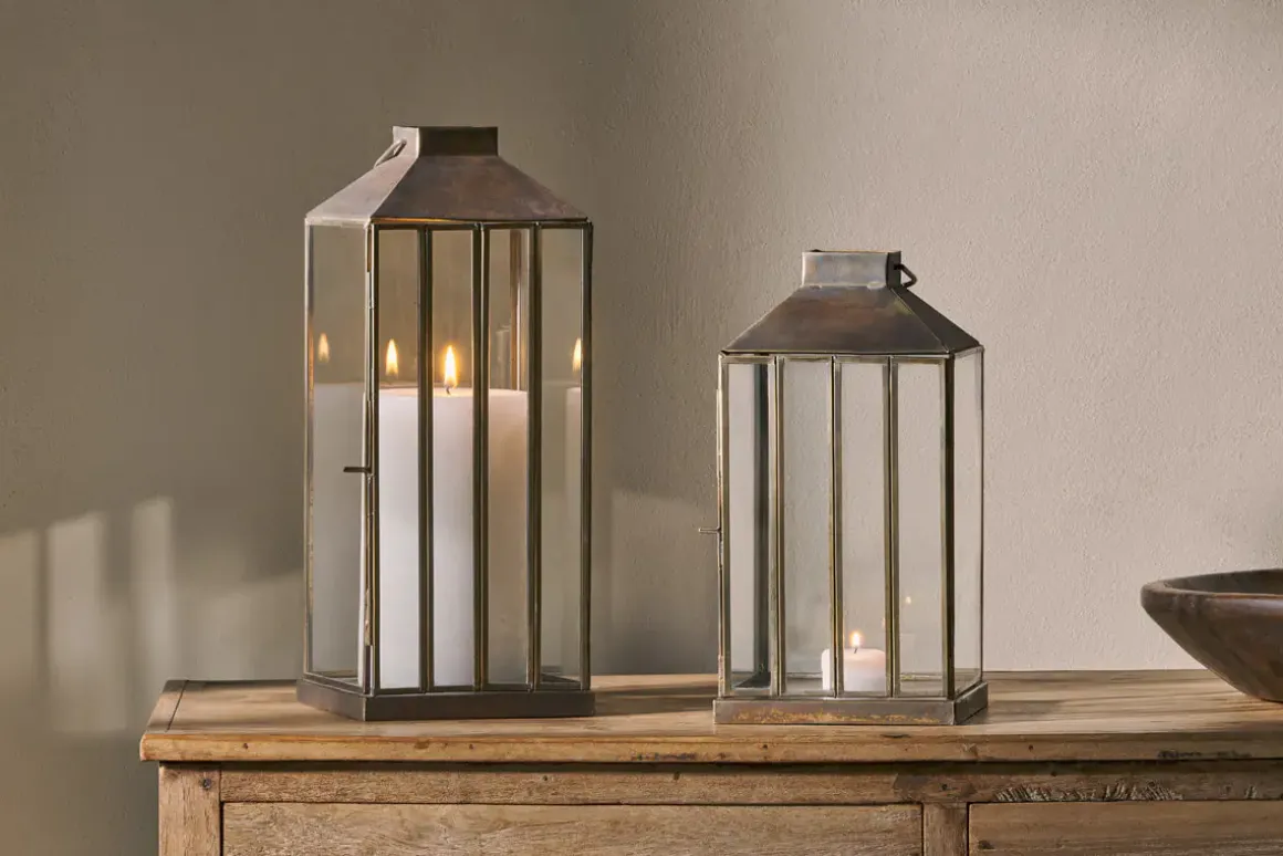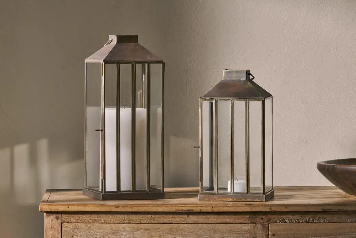 Our large Nampo Lantern has an aged antique finish and slender glass panels which come together in an elegant yet sturdy design that adds the perfect finishing touch to a room, lifting a space with a pop of brass and glass, and a clean, uncluttered silhouette that draws the eye. Perfect displayed in a hallway or in a living space, looking resplendent as a pair on either side of a fireplace or entrance. Use singly, with the smaller Nampo Lantern or as a pair for striking effect. Pair with our rustic pillar candles.