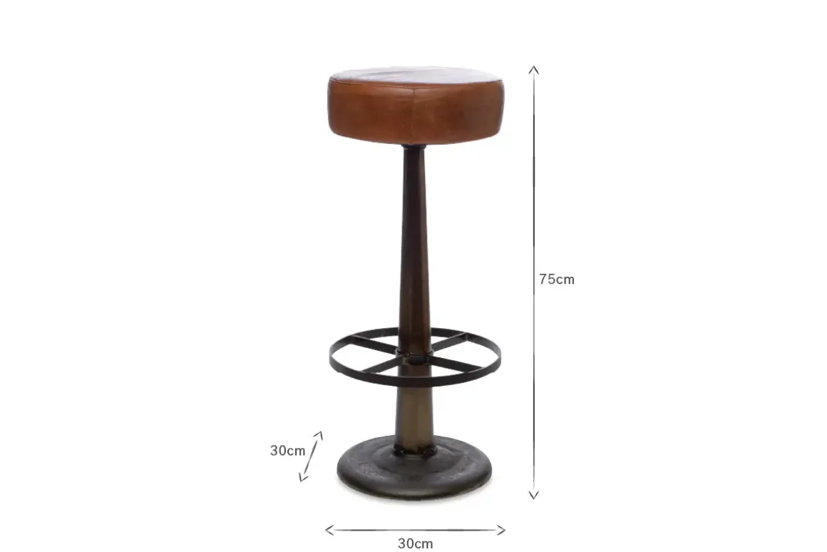 These stylish Narwana bar stools have an aged leather appearance and rich tanned finish that is enhanced by a bold dark iron base. The padded seat and useful footrest provide comfort and style.