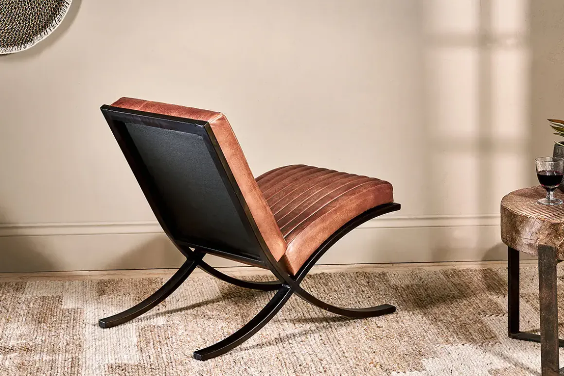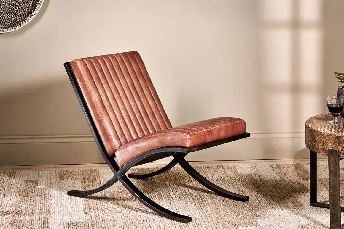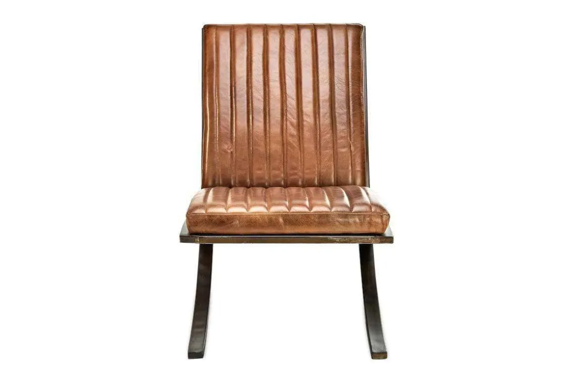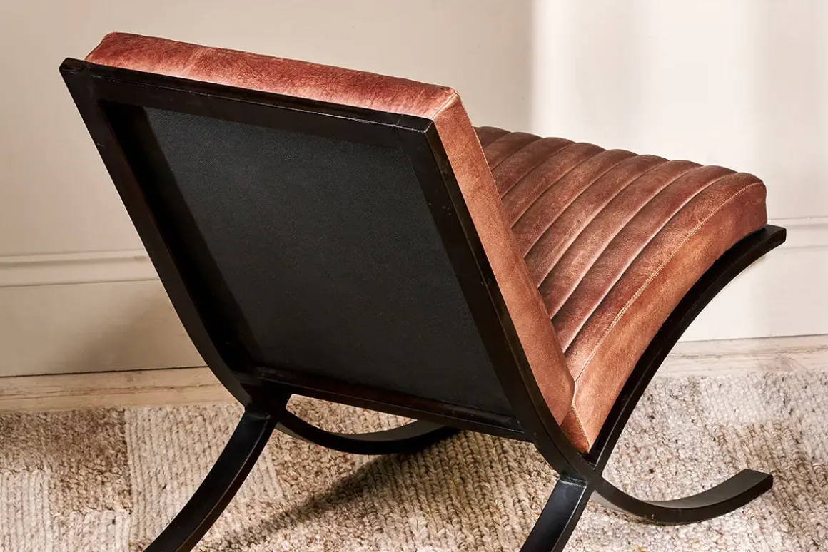 These statement Narwana leather chairs have a soft padded seat and back which is finished with stylish ribbed stitching. The simple, curved iron base adds to the look of the piece.