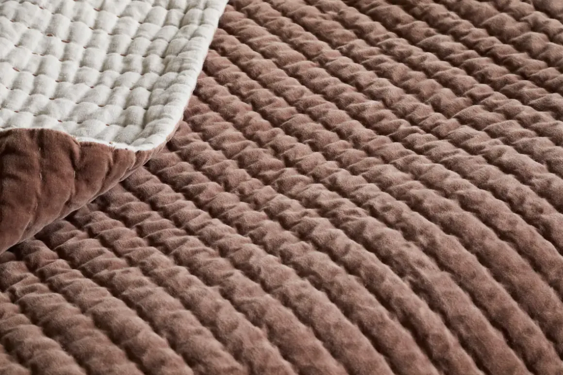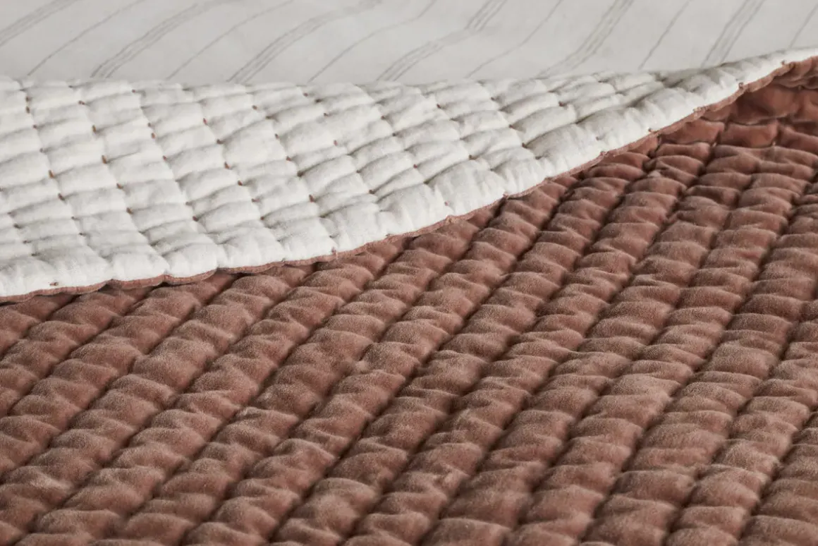 This luxurious quilt combines a warm rust cotton velvet top with a natural linen base, offering a beautiful contrast in texture and tone. The hand-stitched Kantha quilting adds subtle detail, while contrast stitching on the reverse provides a refined finish. Soft, cosy, and generously sized for King and Super King beds, turn vertically for a longer drape on a Super King.