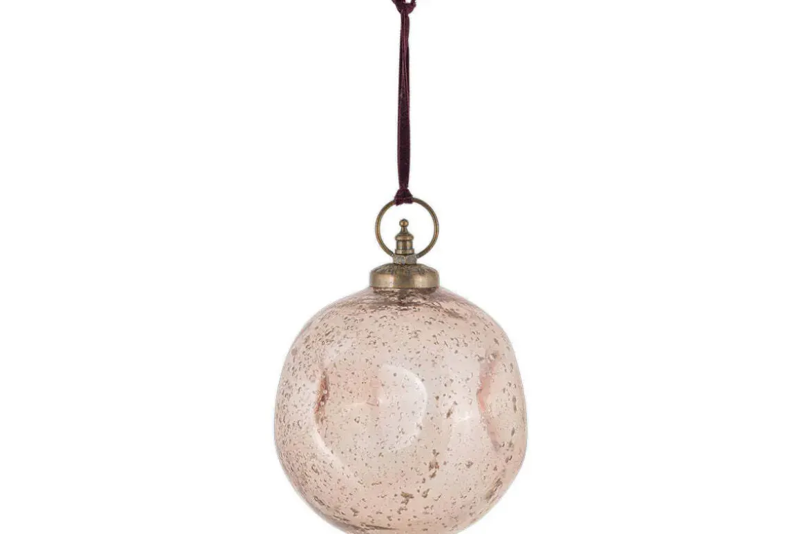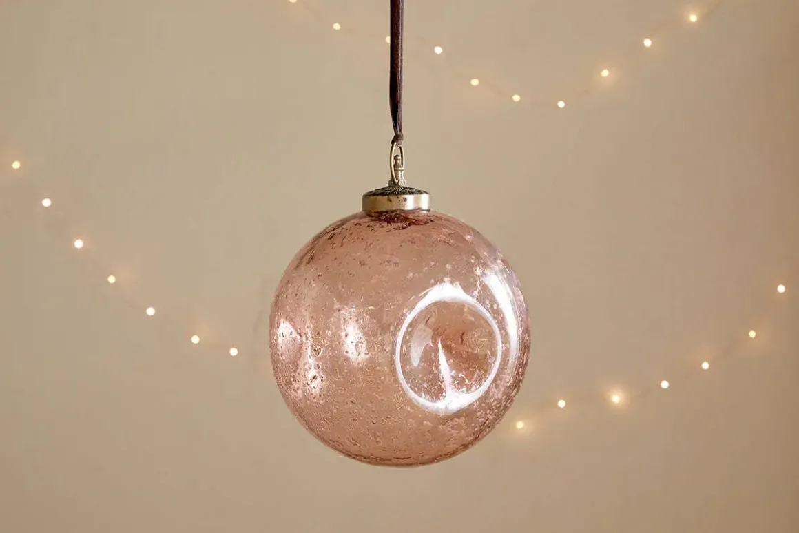 With its softly pinched shape and deep burgundy velvet ties, this giant Nishan bauble brings a unique, decorative touch to festive displays. Made from recycled glass, its gently irregular form catches the light beautifully, adding a statement piece to your festive decorations.