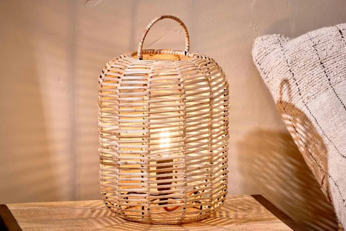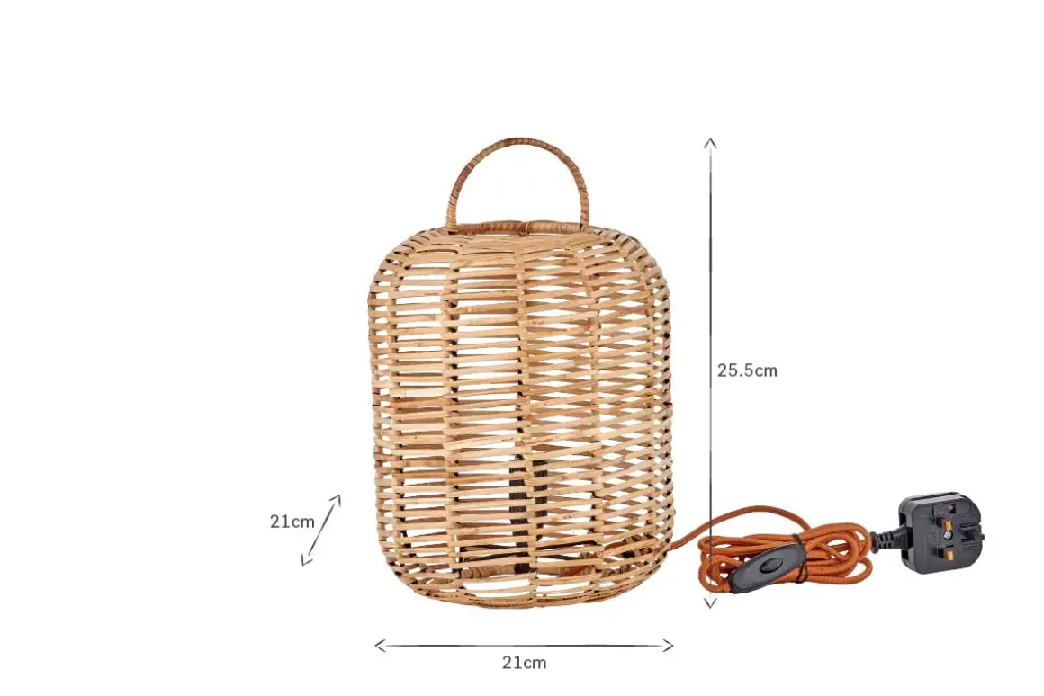 Natural wicker and unique design combine in this attractive small lamp. Beautifully crafted from strands of wicker that diffuse and filter the light to produce a soft glow, the lamp casts pretty shadows adding interest to a living space. Versatile and stylish, use as a bedside light or in a living space to create an ambiant mood.