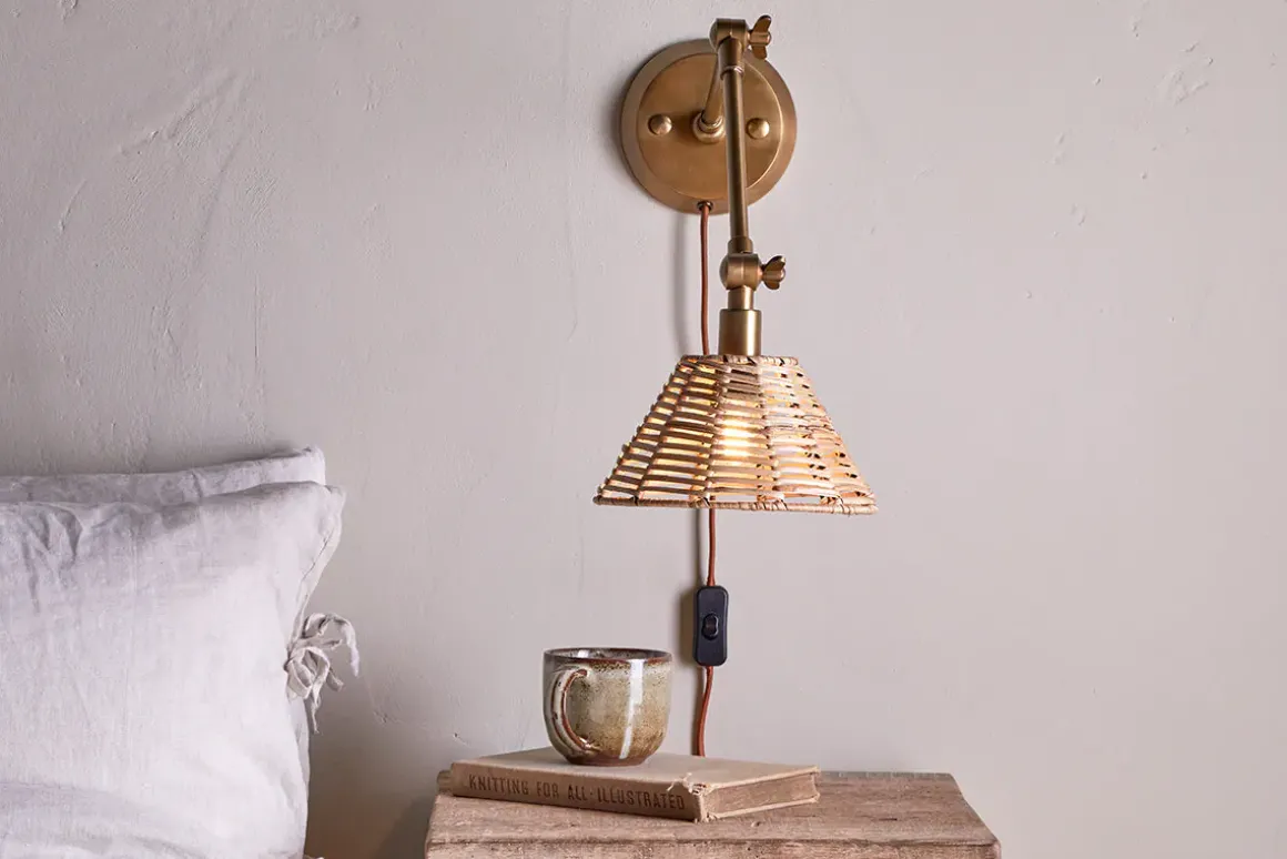Skilfully handwoven using age-old techniques, the rattan shade has an organic aesthetic which is rich in character and texture. This design also lets the light shine through the gaps in the weave, creating a warm ambient glow. The natural tones of the rattan are complemented by the antique brass finish of the arm. This lamp can be plugged in eliminating the need for an electrician. Position as a pair on either side of a bed for an eye-catching display.