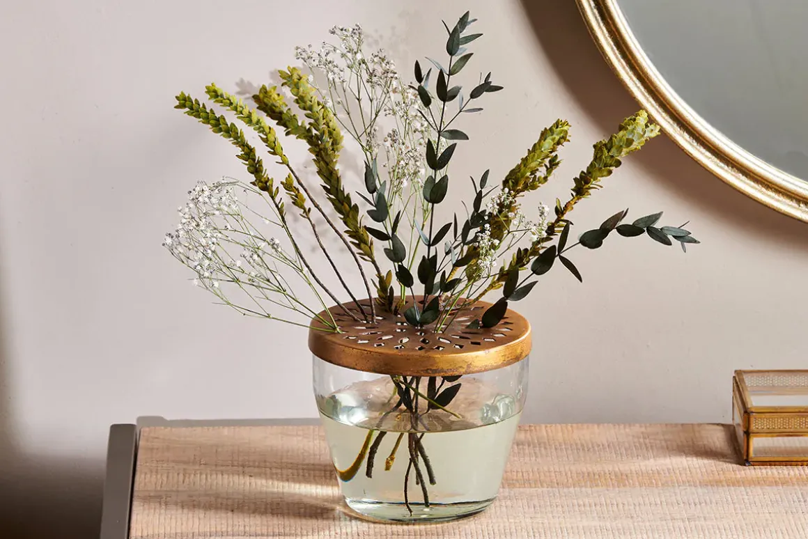 Our circular Ramla vase is decorated with an antique brass lid. The cut out pattern on the lid is designed to hold the stems of flowers and foliage, creating striking displays.