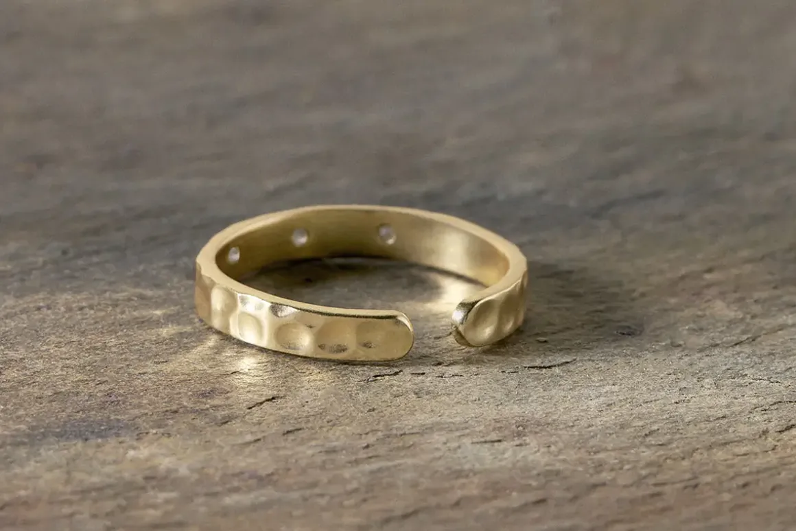 This chunky textured ring is forged from brass alloy with gold plating and three iridescent Labradorite stones set into the face to add extra shimmer to everyday occasions. Labradorite is associated with the throat and third eye chakra and is said to be connected to communication, wisdom and intuition. Hypoallergenic and nickel free. There are matching Ratna earrings available.
