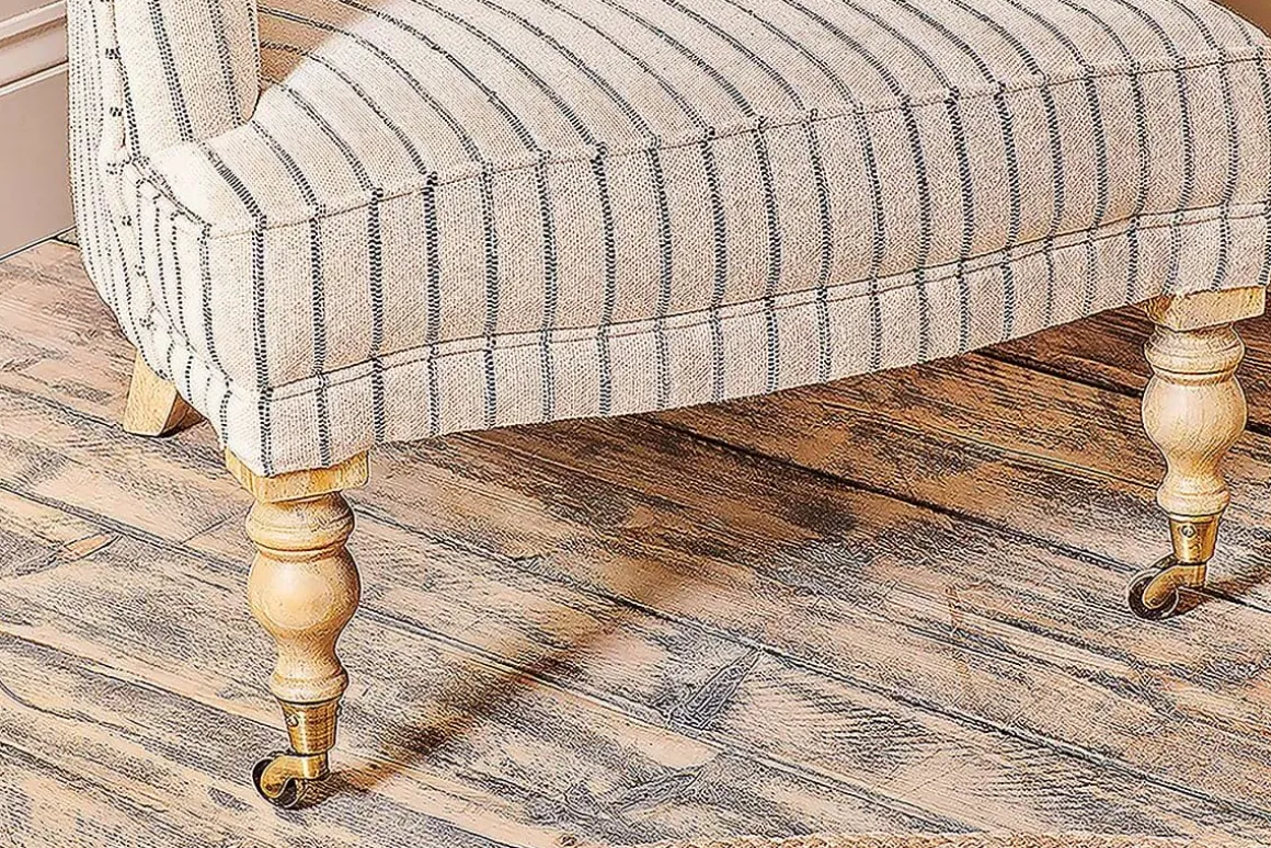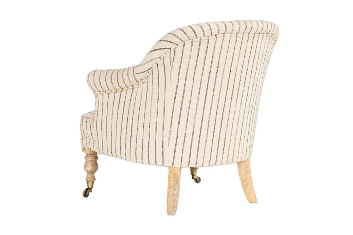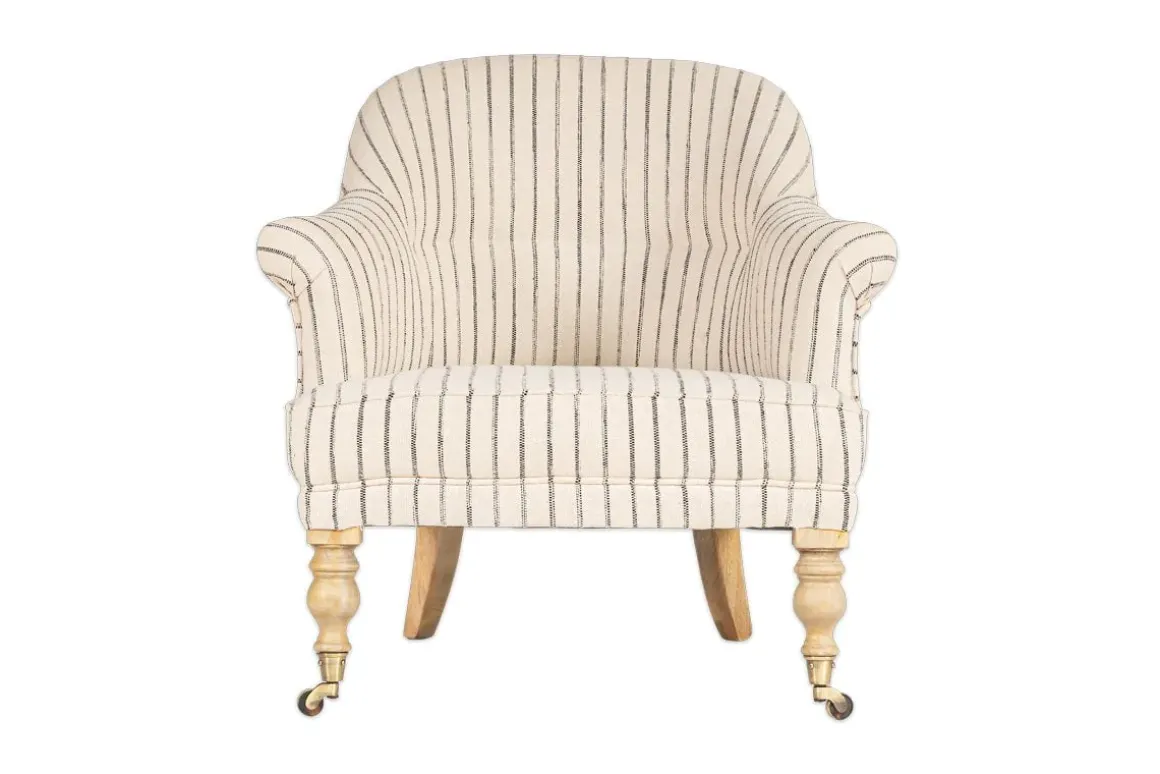 Our Sanja stripe linen armchair makes an elegant addition to any living space. The striped design is both subtle and timeless: a broken black line that contrasts gently against the chairs natural linen base. The Sanja’s curved tub shape makes it exceptionally comfortable and its turned wooden legs sit neatly on castors, adding an attractive decorative detail to the piece and making it easy to maneuver. Pair with our matching Sanja Stripe Ottoman.