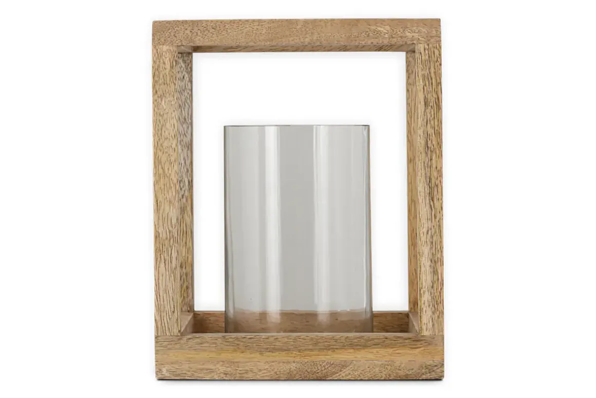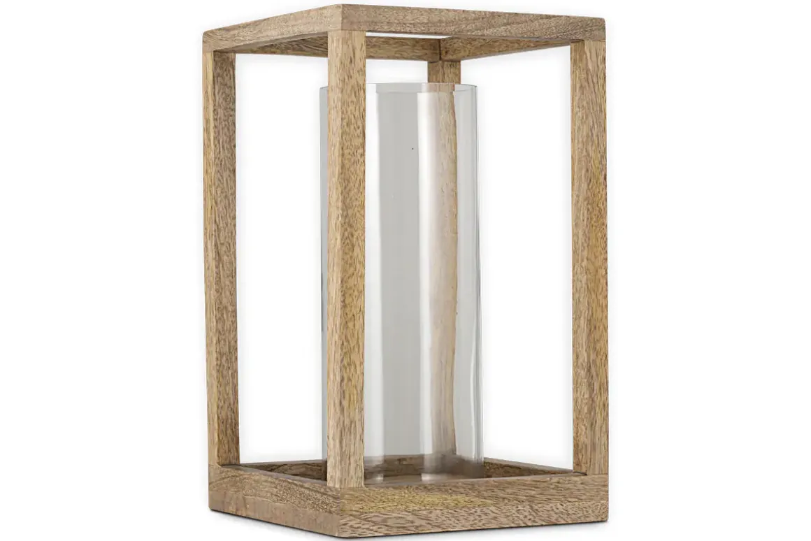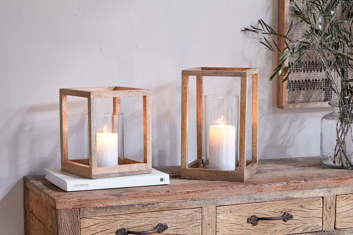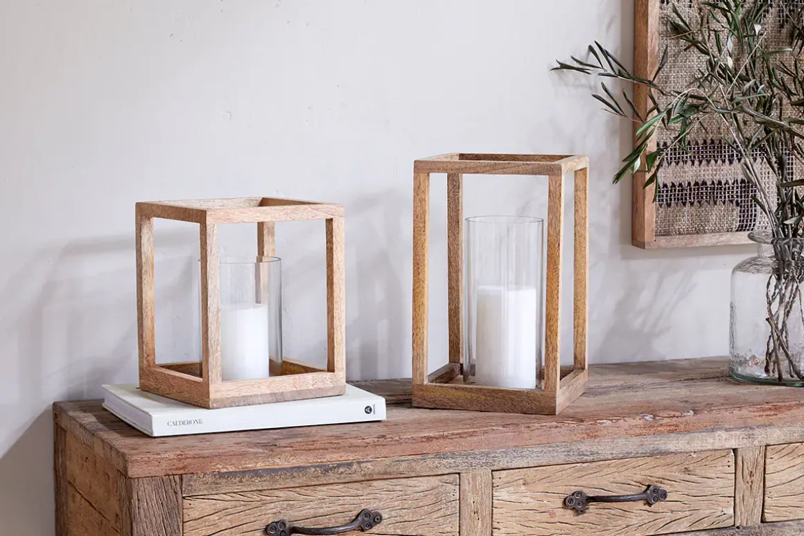 Our Sanora Lantern offers a charming take on the traditional hurricane lantern. Crafted from sustainable mango wood, it presents a softer, more inviting alternative to standard metal lanterns. The accompanying glass case protects the flame while adding a touch of elegance and contrasting texture to the design. Perfect for creating a warm ambiance, this lantern enhances both indoor and outdoor spaces, bringing a rustic yet refined touch to your space. Available in two sizes. Pair with our soy blend Pillar candles.