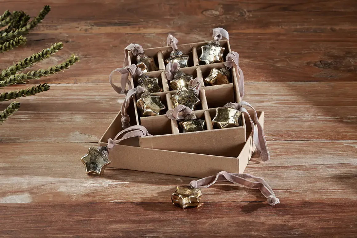 These delicate Sardi Star Baubles bring a delightful twinkle to Yuletide revelries. Hang liberally on a bare branch or in clusters twinkling among foliage, these organically shaped baubles are much loved and are fabulous teamed up with our larger Set of 4 Sardi Stars for harmonious form and contrasting scale. sumptuously decked-out tree or bare branch display. Finished with an antique-style clasp and elegant velvet ribbon. Available in clear or antique gold.