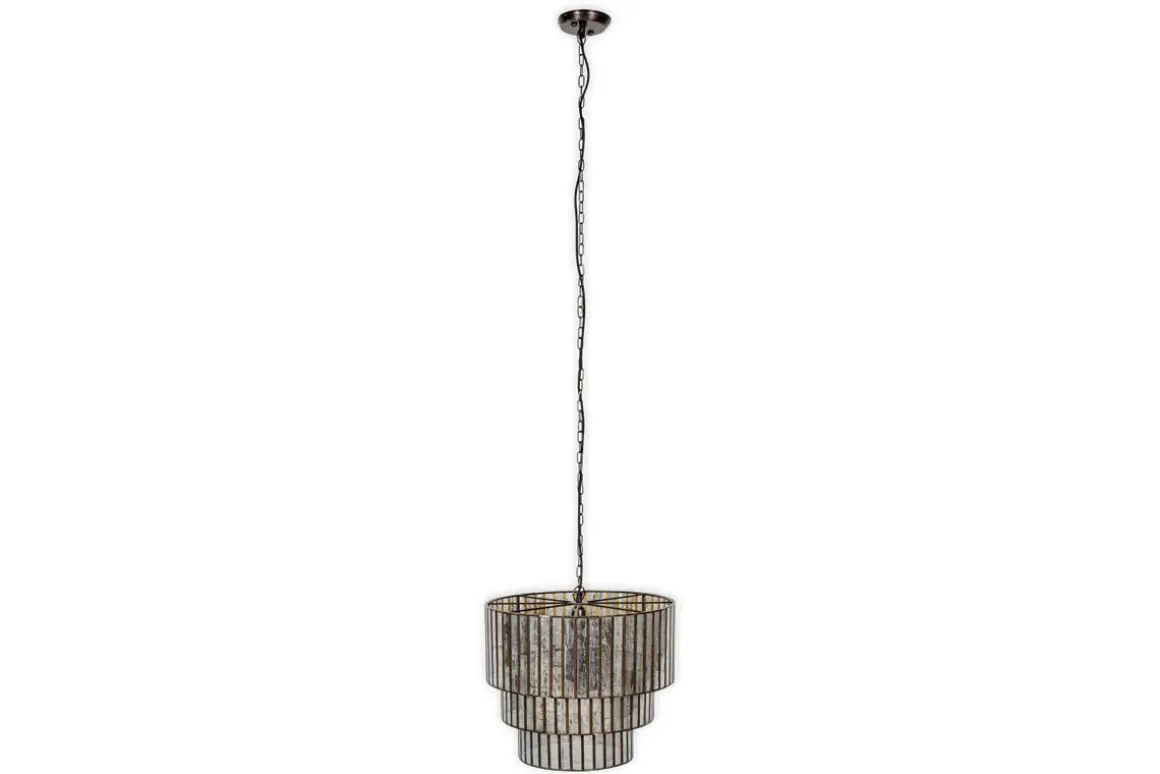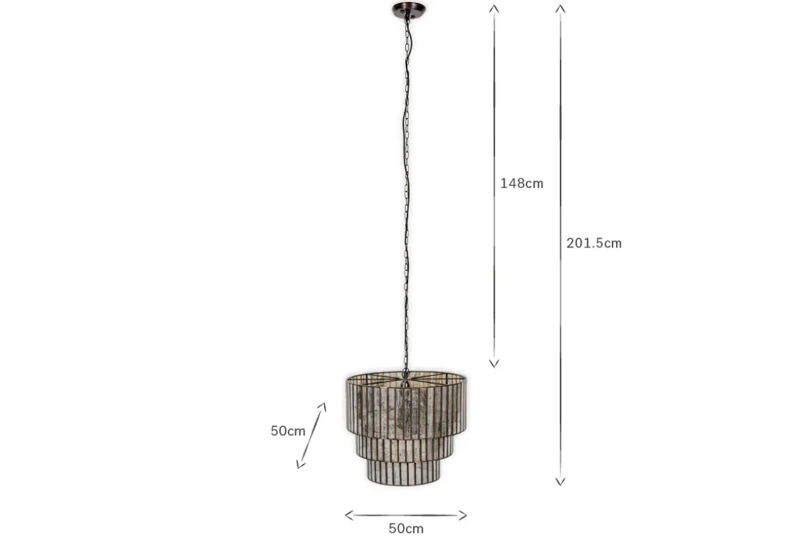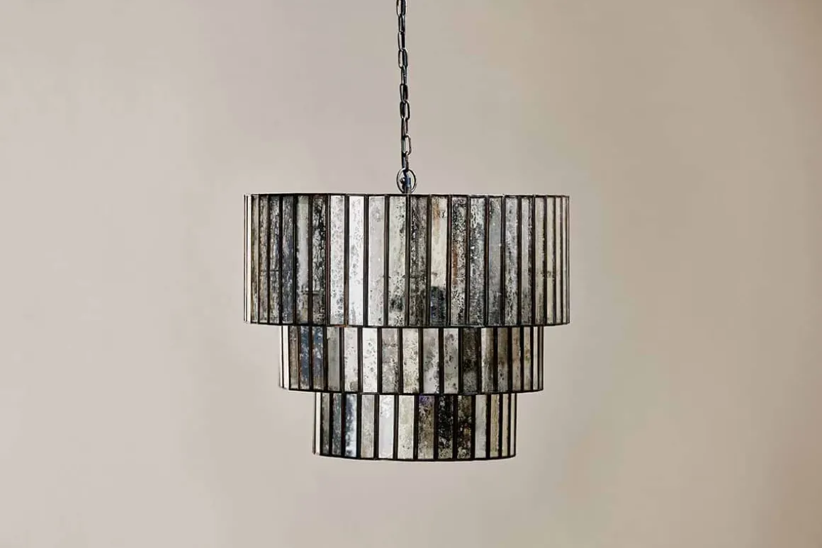 Our Shanaya chandelier is a real showstopper. Its three-tiered statement design made from antique bronzed metal with panels of mercury-finished glass not only looks beautiful unlit, but will diffuse a warm glow in your chosen location. Perfect as an arresting hallway chandelier or as a centrepiece in a living room or dining room. Each tier sits beautifully within the other for a cascading effect of shimmering aged glass that we’ve hung from a simple link chain with an understated dark flex to match.