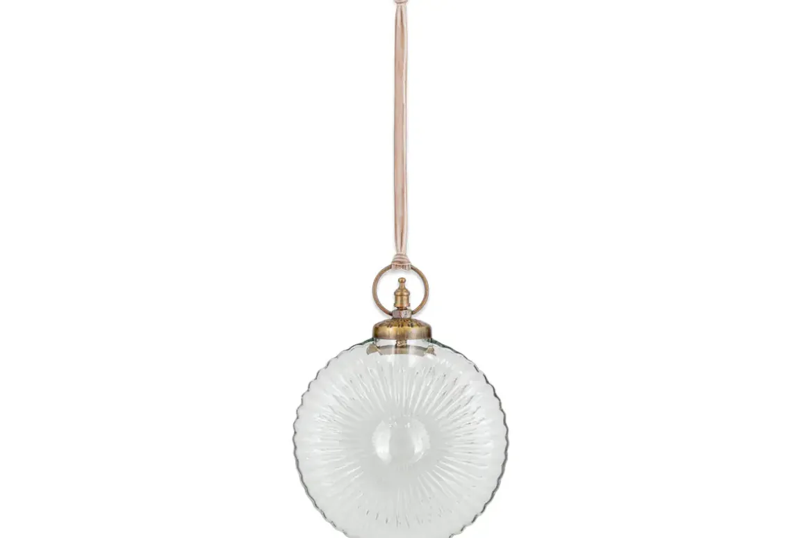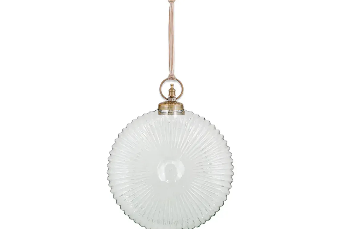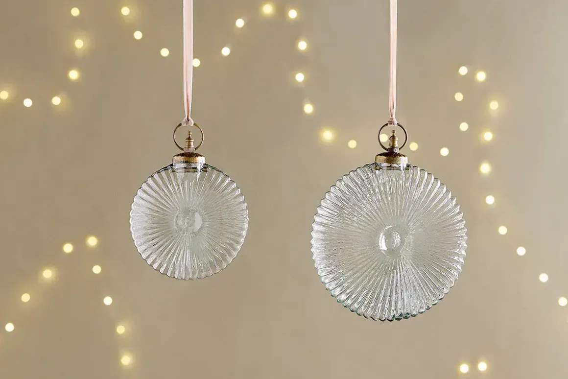 The uniquely striking disc-like form of our Sundara Bauble has been scaled up and given generous proportions, perfect for a festive scheme celebrating the unique wonders of the world around us. Created from recycled clear glass and mouth blown for an antique look and feel, this design inspired by beautiful ammonite fossils lends a natural elegance to any scheme: delightful alongside festive foliage, organic objects and natural materials. Finished with an antique-style clasp and elegant velvet ribbon. Available in two magnificent sizes.