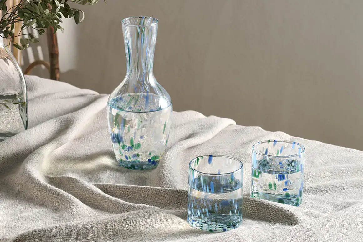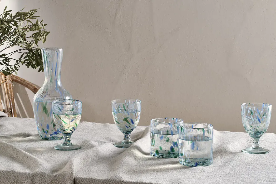 The mouth-blown, the recycled glass Taja Decanter brings a soft palette of fresh aqua tones in gentle blues and greens to instantly freshen up a table setting. Coloured glass fragments areintroduced to the clear molten glass, creating a free-flowing design and unique finish that is also highly durable as the pattern is contained within the glass itself. The stylish, organic design, with its sturdy form and gently uneven rim, heightens the individual beauty of each glass.