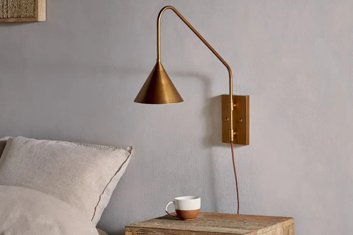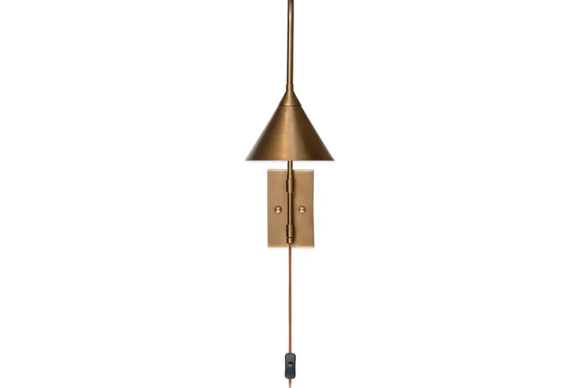 The Thottam wall lamp in antique brass is a unique statement piece that adds a sophisticated yet contemporary touch to your living space. The adjustable swing arm is perfect for bringing directional light to a reading nook, or additional light wherever its needed in a room. The sleek form makes this an elegantly versatile piece. It has been designed to be ready to use, simply plug it straight into a mains socket and fix to the wall. The rust coloured lead adds a stylish finishing touch.