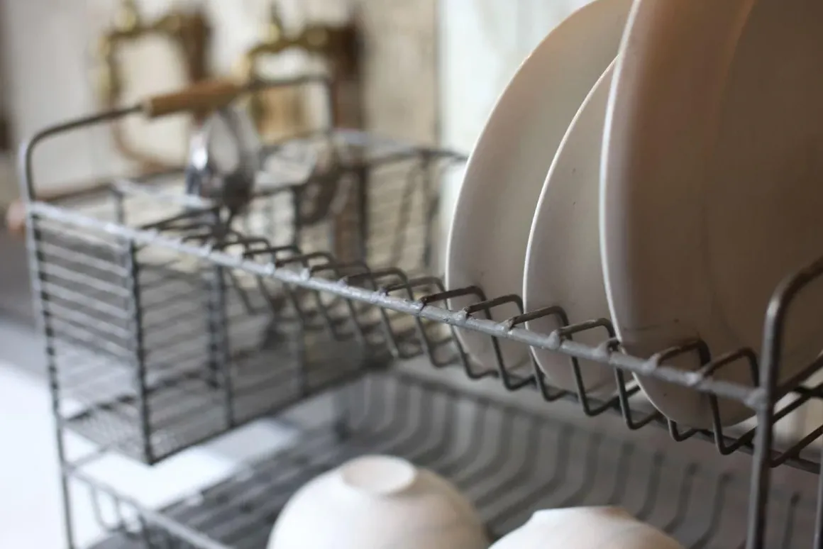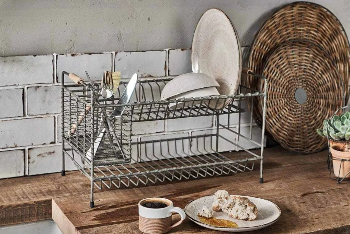 Our Tilmo Dish Rack is a stylish take on an everyday item. This industrial looking metal rack comes in a distressed grey finish. It contains practical plate racks and storage compartments for drying utensils. Who would have thought you could make washing up such a stylish chore
