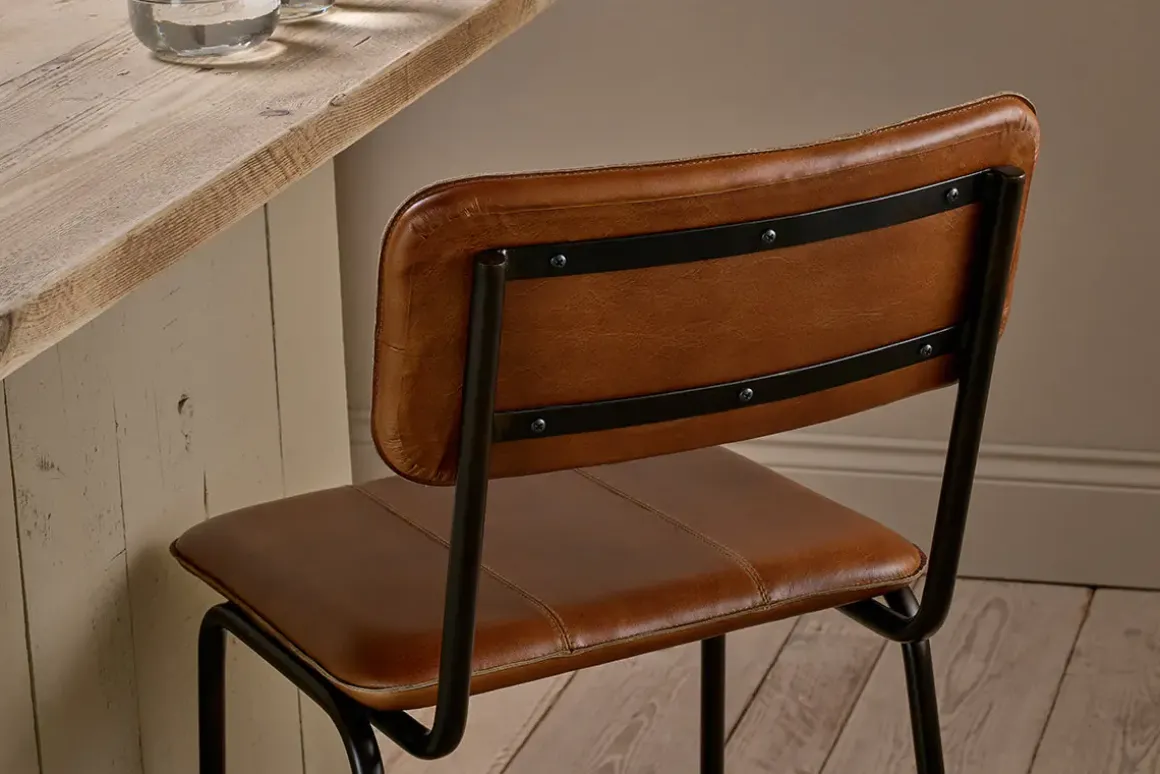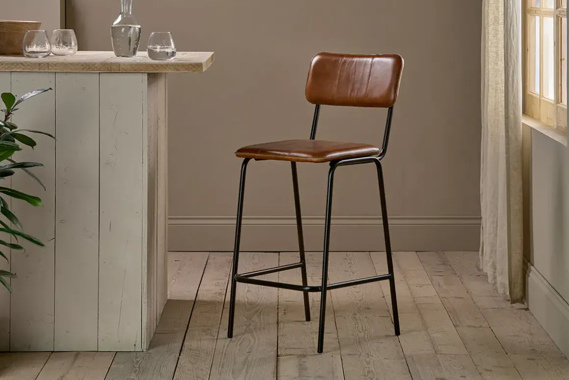 We’ve added this aged-tan leather counter-height bar chair to our best-selling Ukari collection. This practical, durable, and comfortable design has a simple, solid iron frame and footrest, and a padded seat and back support. Upholstered in handmade buffalo leather, it is stitched to create three panels which adds a stylish design detail to the piece. Designed to work with a kitchen island, counter or breakfast bar, the Ukari counter chair tucks neatly under a kitchen counter top. The leather upholstery is a by-product and is dyed using vegetable extract and tree bark which means the leather colour will enrich further with time. The Ukari collection includes dining chairs and counter stools in a selection of rich colours.