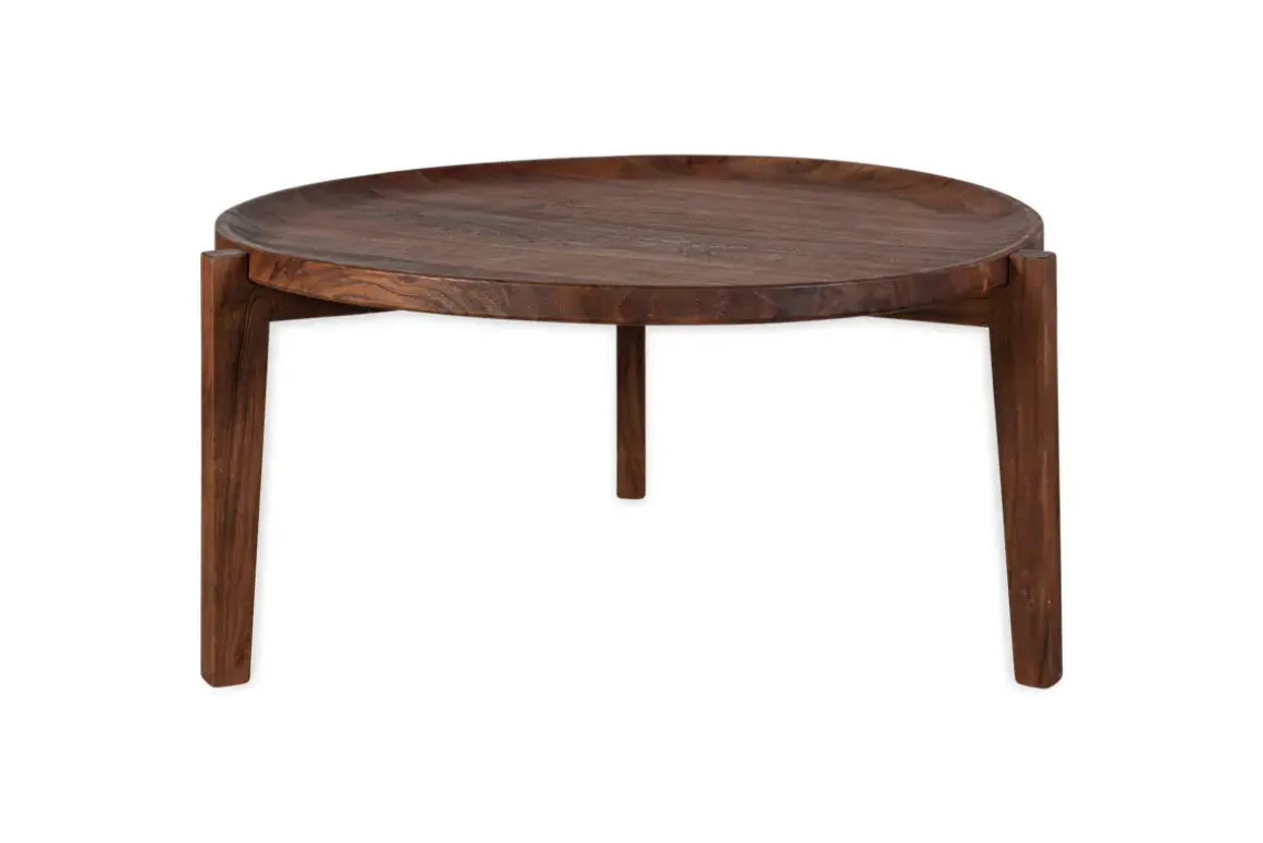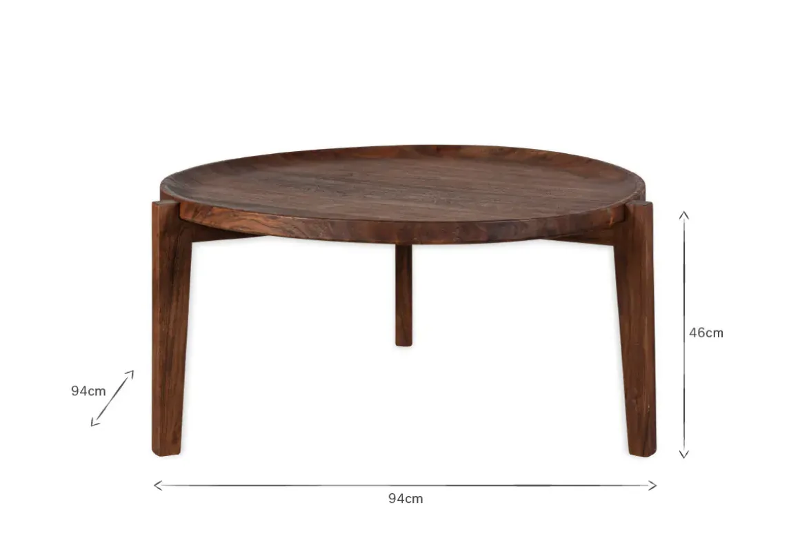 This sophisticated coffee table is made from Mango Wood that we love for its warm natural tones and beautiful grain. With a stained dark finish, the circular table top has a gently sloped edge that sits into a base formed by three leg supports, creating a simple yet stylish silhouette, perfect for displaying a few choice decorative objects and favourite books. This is a striking piece that will elevate a living space and draw the eye with its elegant sculptural design.