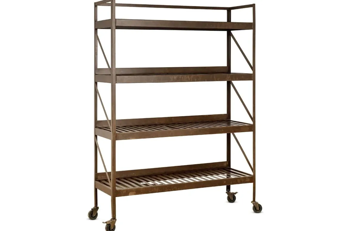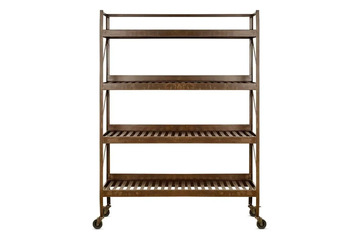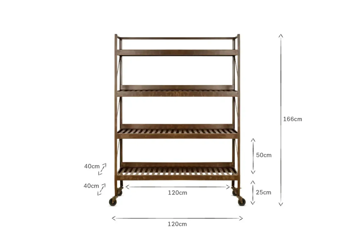 With its eye-catching industrial aesthetic, our Umi shelf unit is a stylish way to store your kitchen utensils. Its utilitarian appearance is enhanced by the striking rust finish and locking casters, which also means the it’s easy to move. Four generously sized slatted shelves provide ample storage space. This shelf unit adds a contemporary and practical note to a kitchen or pantry but its rich tones can also provide a beautiful backdrop to your houseplant collection, making this a truly versatile item.