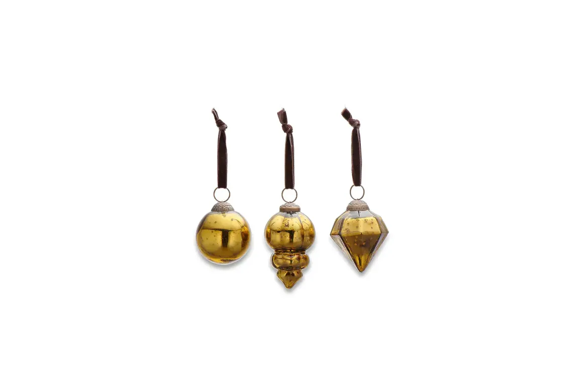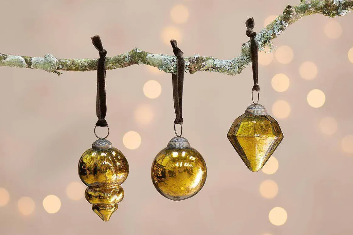 Eye -catching and elegant, the rich antique green tone of our Ura baubles gives them a distinctive festive quality. The set of three baubles come in three appealing shapes, each strung with a brown velvet tie. The Ura collection mixes perfectly together and we recommend mixing all the colours in the collection for a striking festive display.
