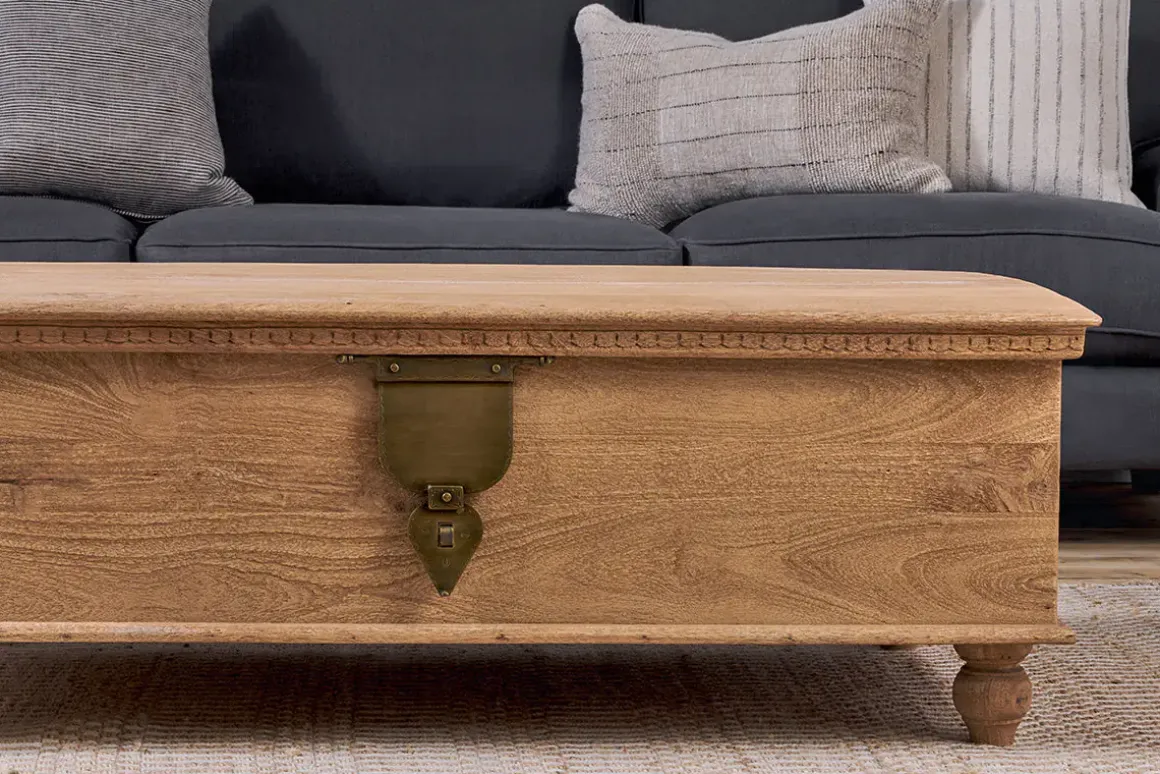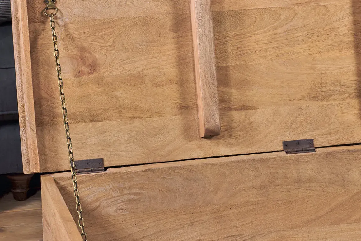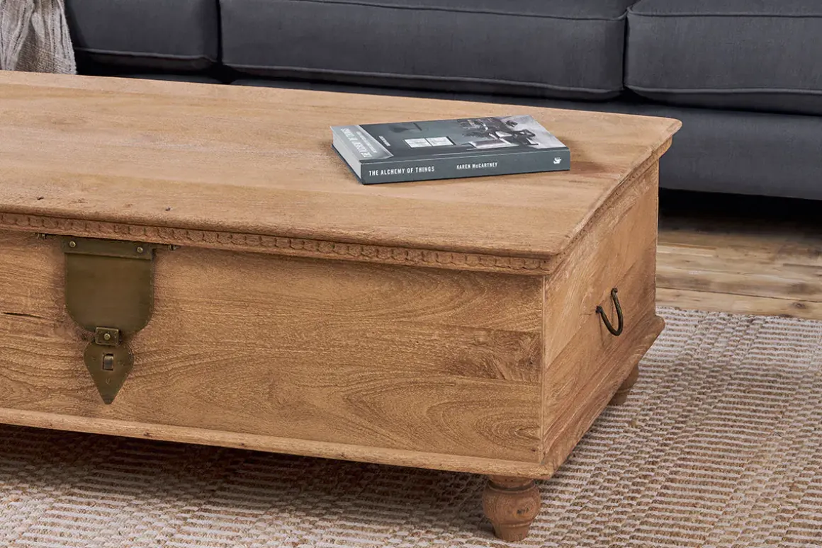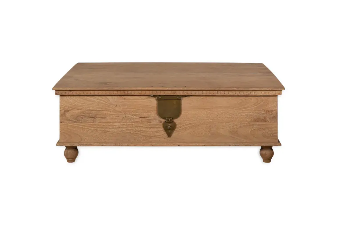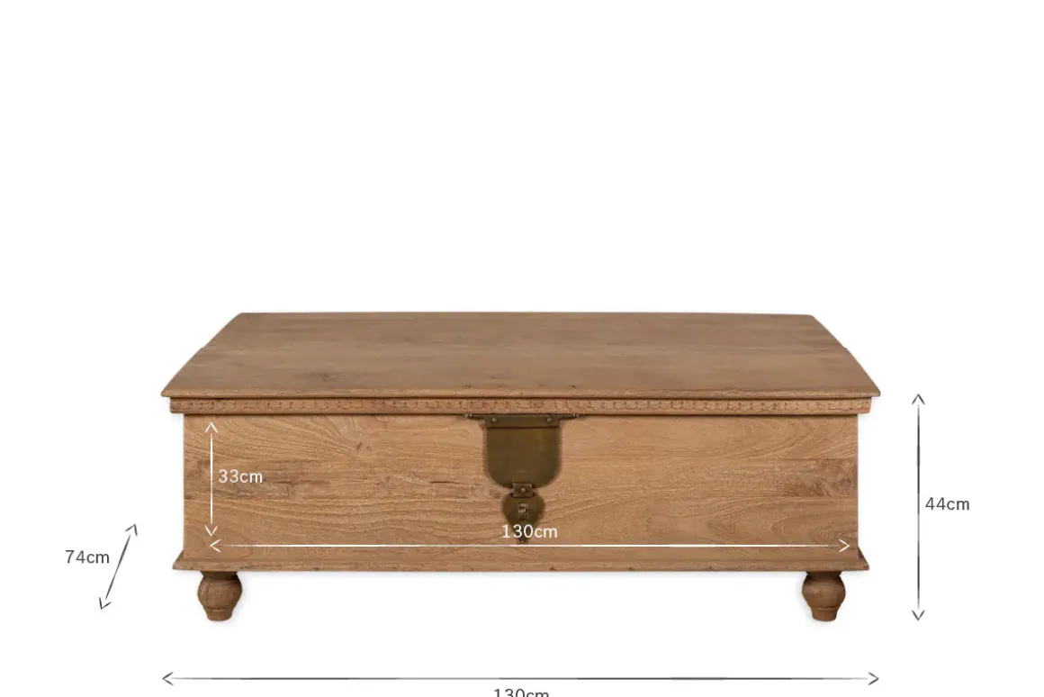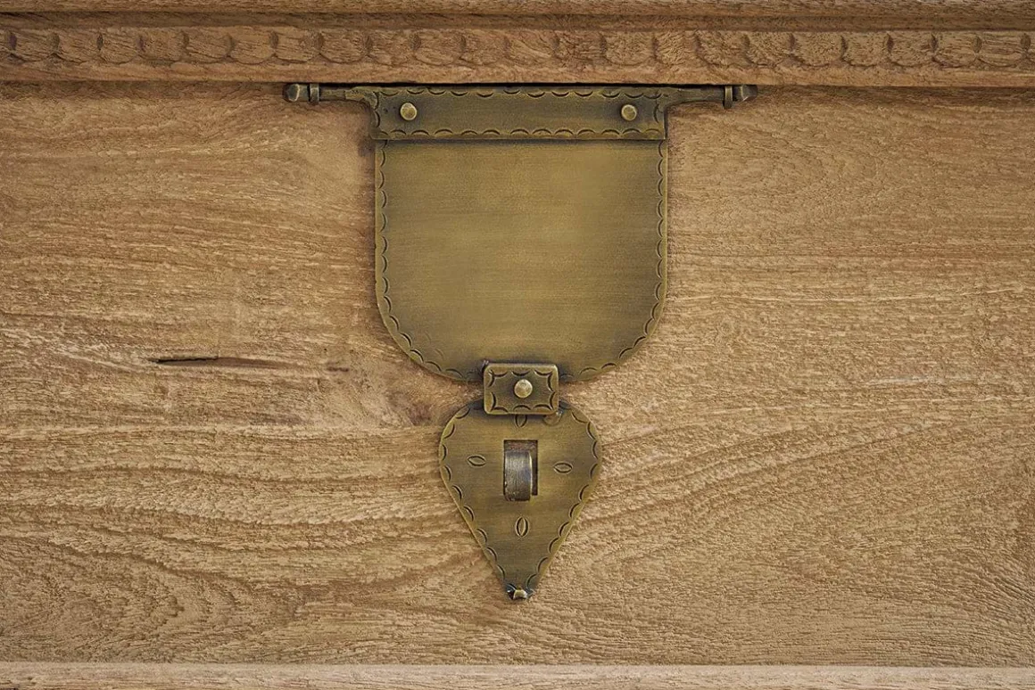 This traditional looking mango wood Vidur chest, modelled on an antique Indian design, adds real character to any living space. Solid and extremely sturdy, with carved details, hand-turned feet and hand-forgedhardware, it adds interest to a living room and is perfect as a coffee table with a lamp, decorative objects or candles arranged on the top, or at the end of a bed. Equally, its voluminous storage makes it ideal for keeping spaces such as a hallway or boot room uncluttered.