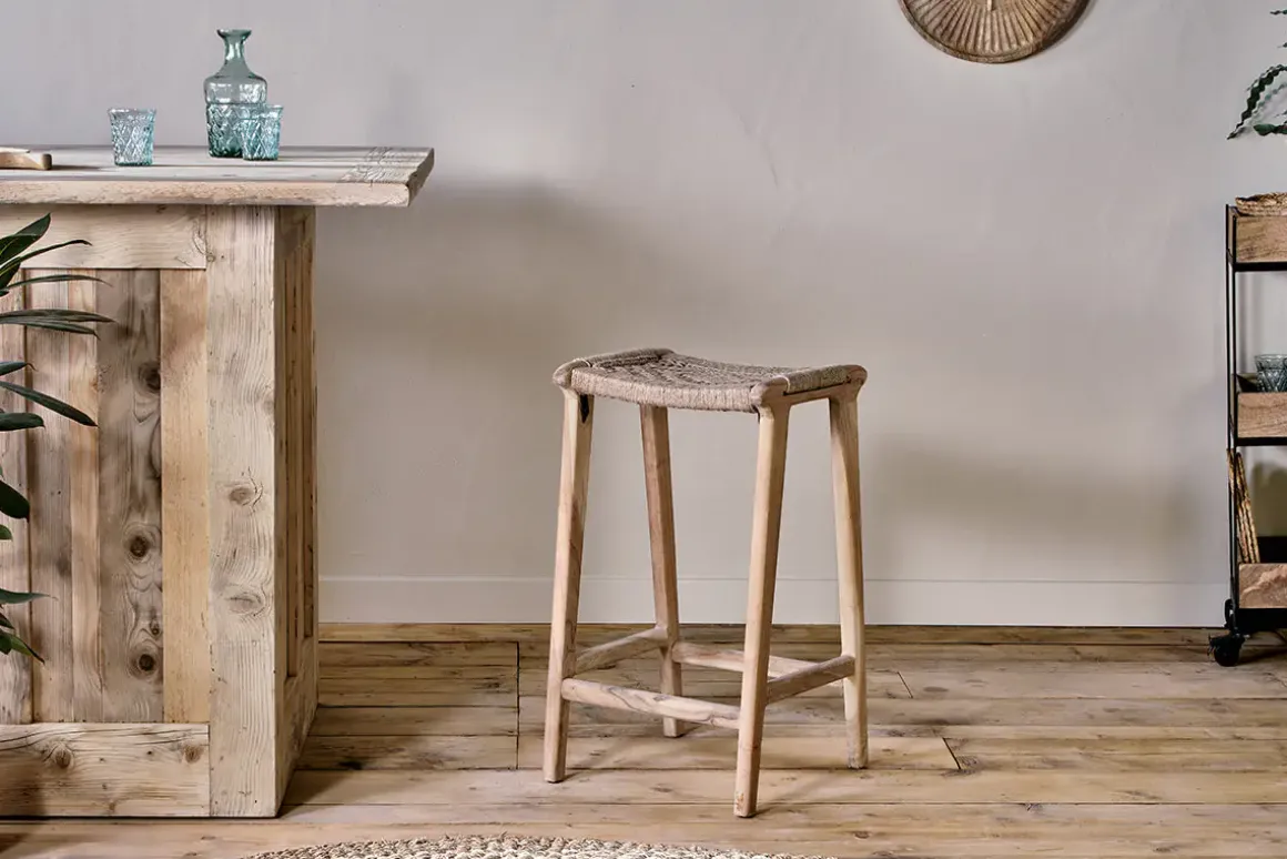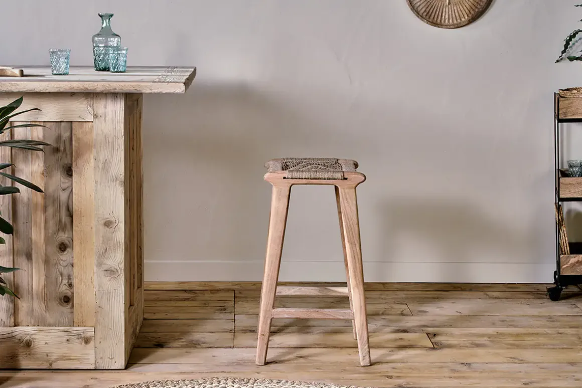 The Vinay counter stool is a rustic and relaxed piece that will fit beautifully into a neutral kitchen or laidback bar space. The natural Acacia Wood legs paired with the natural jute seat make this is a simple design with an effortless aesthetic. Made from durable materials, we chose to work with Acacia Wood and Jute, which is a fast growing crop that requires very little water. Please note, a dining chair is also available in the range.