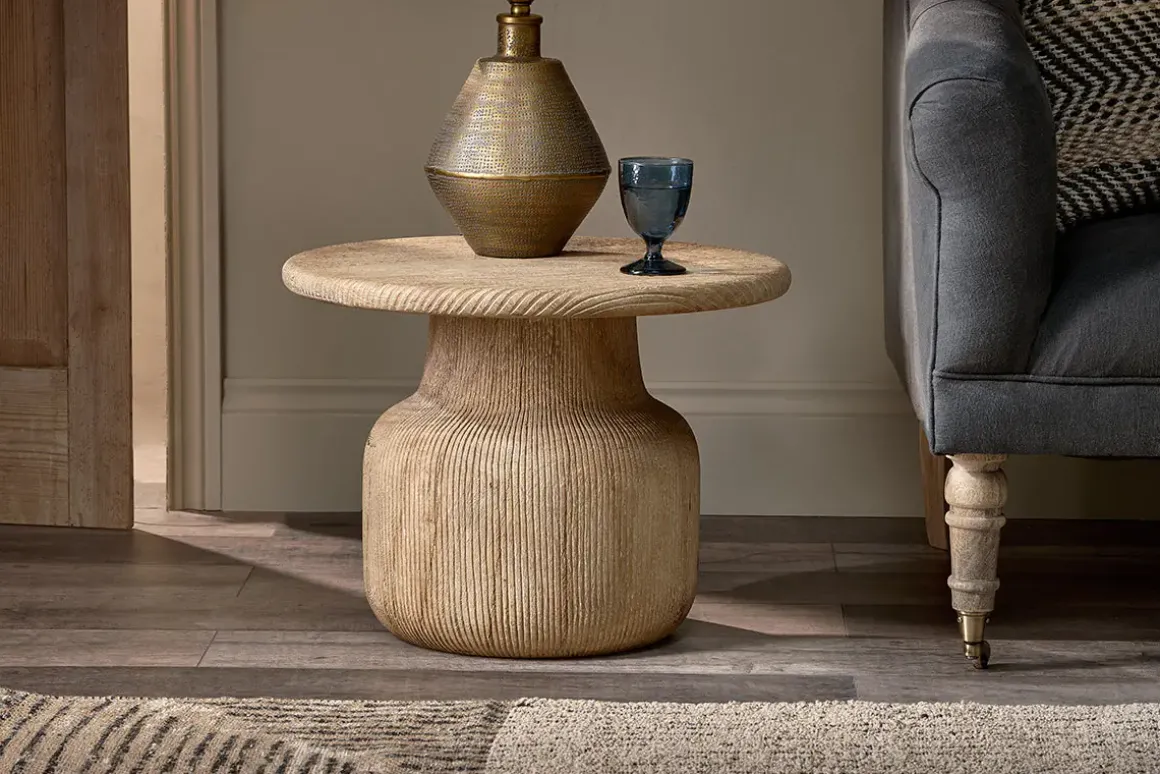 The heavy-weight, organic design of our Vivan side table makes it a standout piece that will look beautiful in any setting, from living room to pool house. Hand-carved from sustainable mango wood with a beautifully textured grooved surface that accentuates its simplicity and style, this generously proportioned table has a fresh contemporary feel that is effortlessly elegant. A coffee table is also available in the collection.