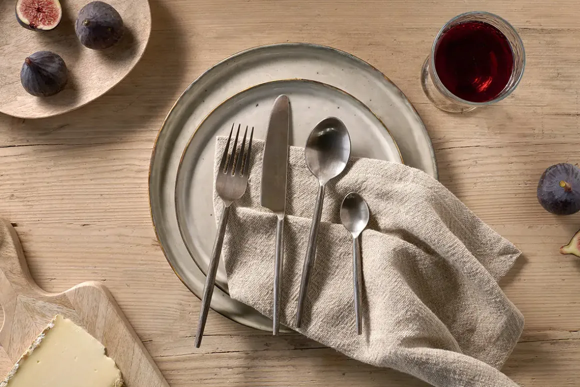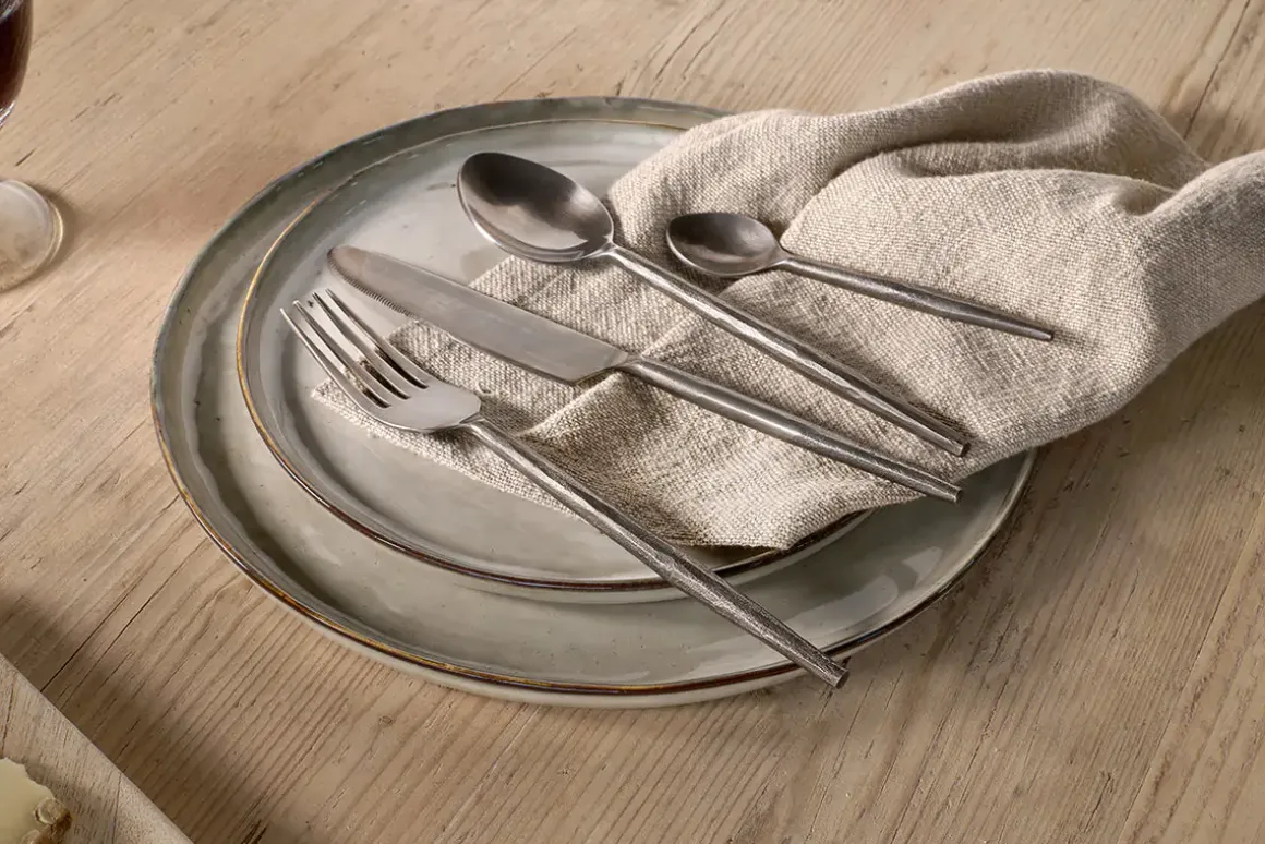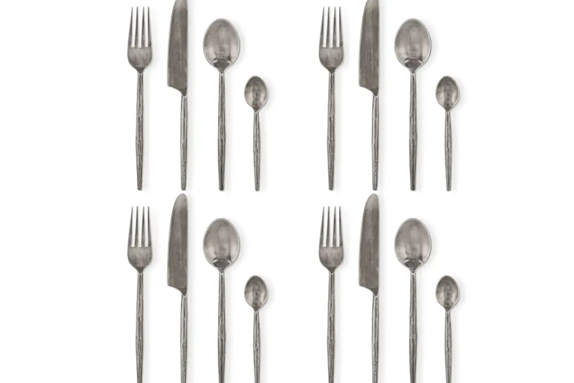This 16 piece cutlery set in forged iron has a contemporary, relaxed aesthetic that looks stylish as part of an informal table setting. Each piece is hammered by hand for a wonderfully textured finish in matt black.