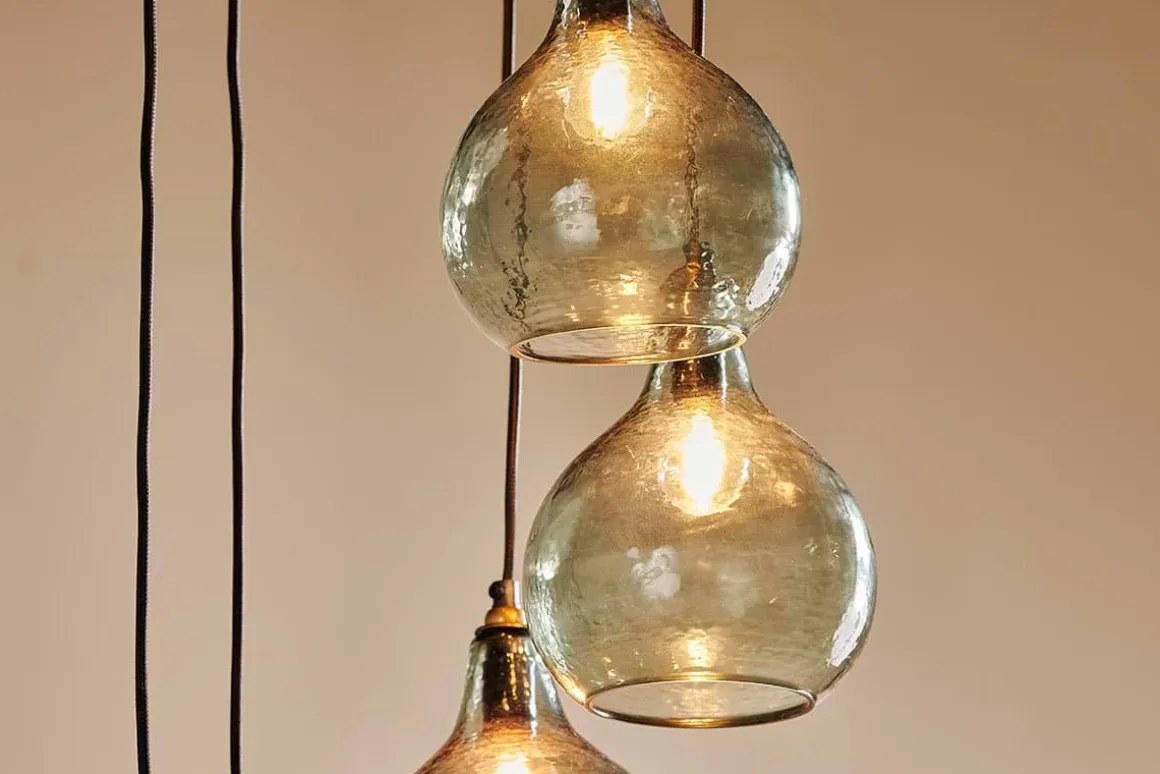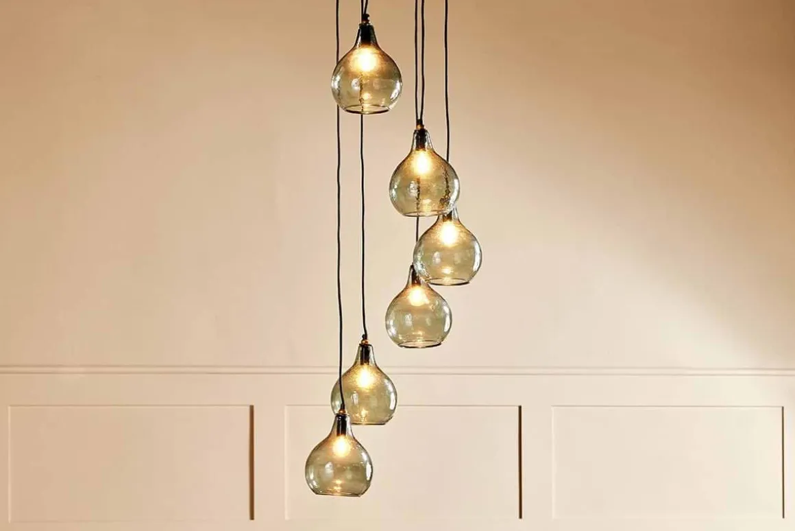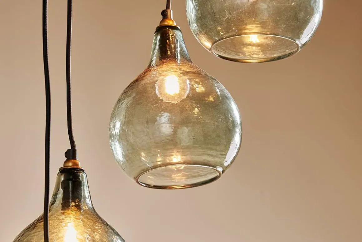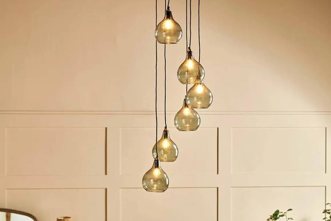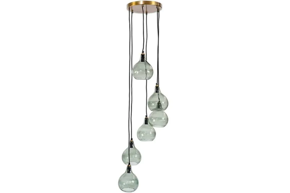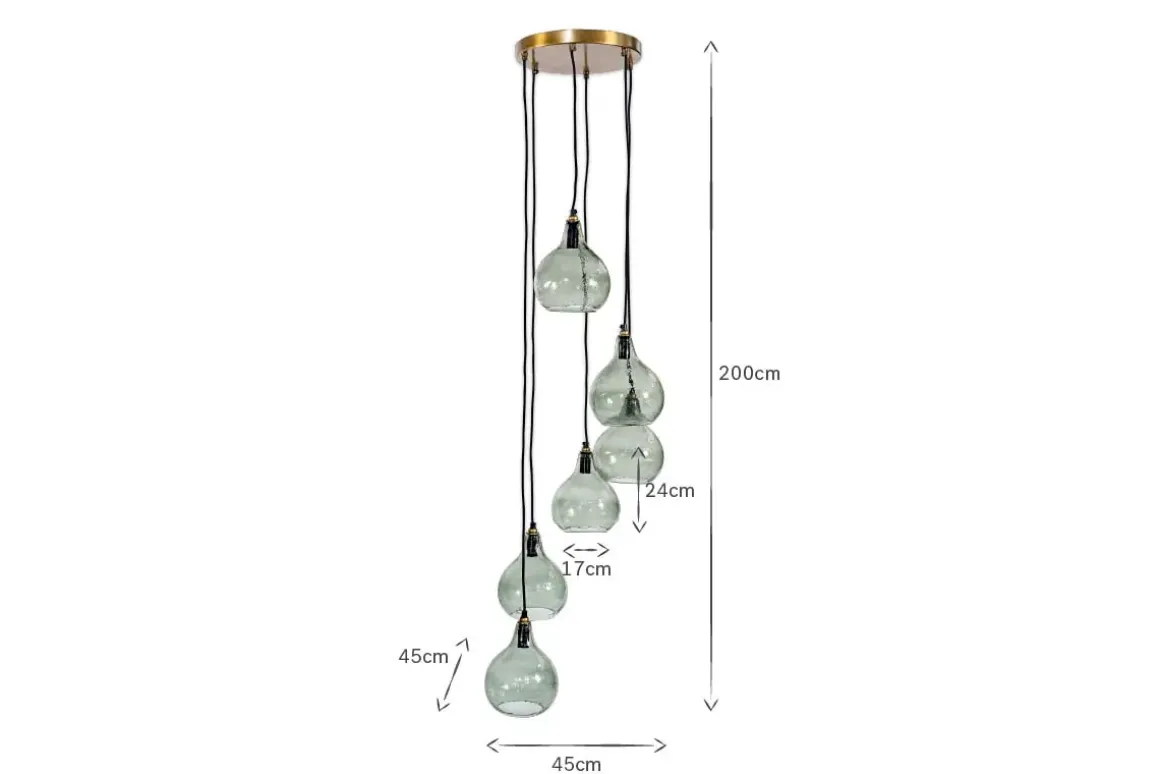 The smoke-coloured hues of the Zia cluster pendant light combine beautifully with the hammered finish of the glass. Each tear shaped pendant is expertly crafted from recycled glass. The six pendants hang at varying heights, creating a dramatic display that promises to enhance a dining space or hallway. The Zia cluster pendants have a black fabric cable and aged brass ceiling rose that add the finishing touch to this unique feature light. The design of the Zia is well suited to high ceilings.